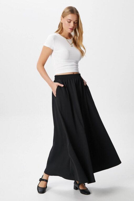 Ritnice Kadın Luna Bel Lastikli Cepli Siyah Uzun Maxi Boy Etek