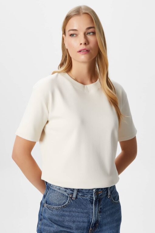 Ritnice Kadın Rise Dekoratif Yaka Tok Doku %100 Pamuk Açık Bej T-Shirt