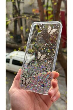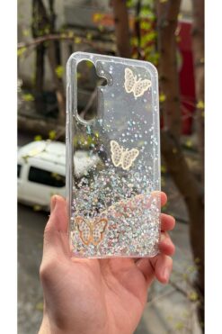 Kılıfın tasarımı zemin üzerine simli ve parıltılı detaylarla süslenmiş olup, üzerine yerleştirilmiş üç boyutlu kelebek figürleri ile estetik bir görünüm kazandırılmıştır.