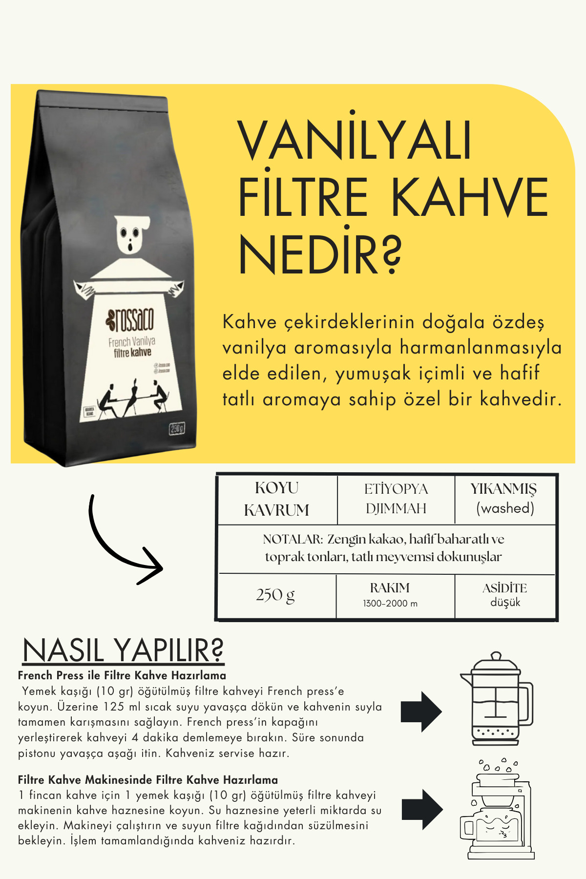 Rossaco French Vanilyalı Filtre Kahve 250 Gr ürünü ucuz fiyat, hızlı kargo imkanı ile hemen sitemizden sipariş verin.