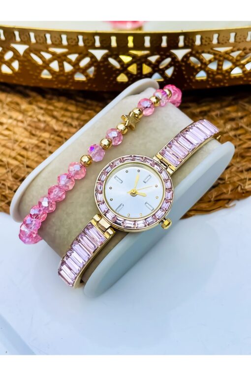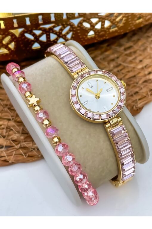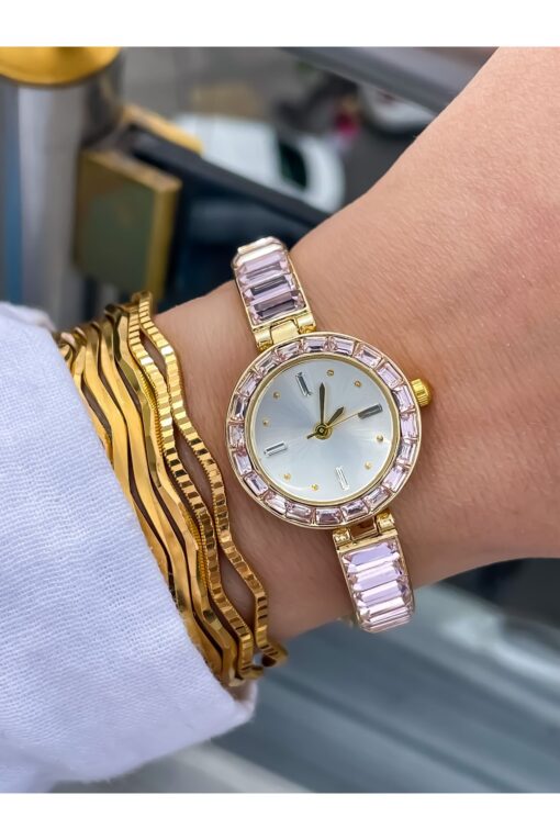 4 ay garanti süresi ile güvenle kullanabileceğiniz yeni sezon altın renk taşlı kadın kol saati bileklik, kalite ve dayanıklılığı bir arada sunar