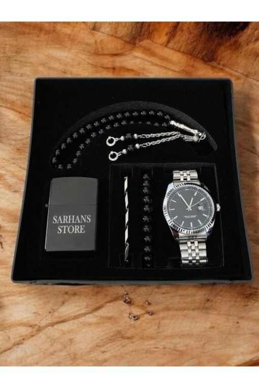 Sarhans Store Kişiye Özel Erkek Saat Seti | Takvimli Saat + İsimli Çakmak + Tesbih + Taş & Çelik Bileklik | Kutulu