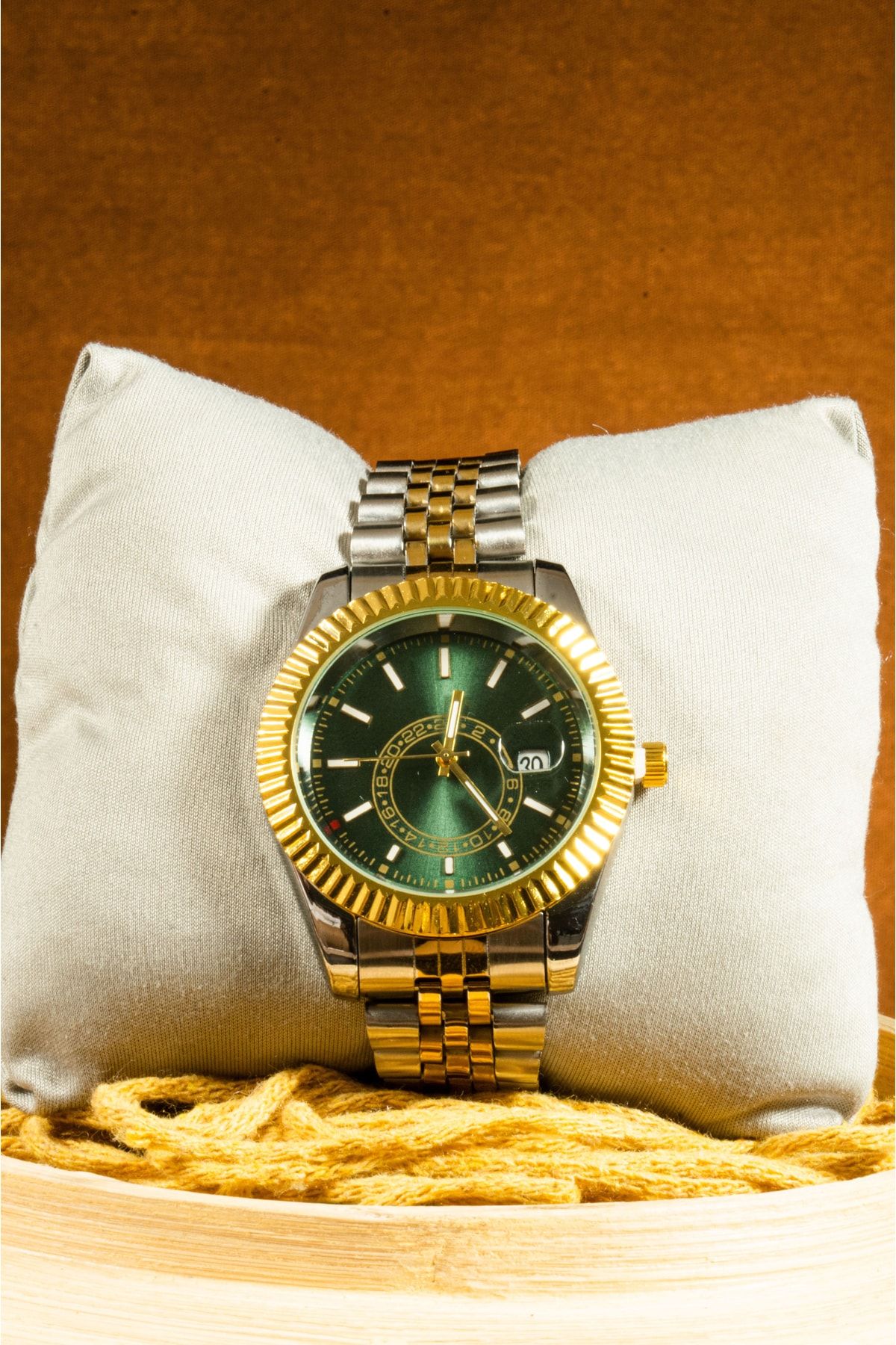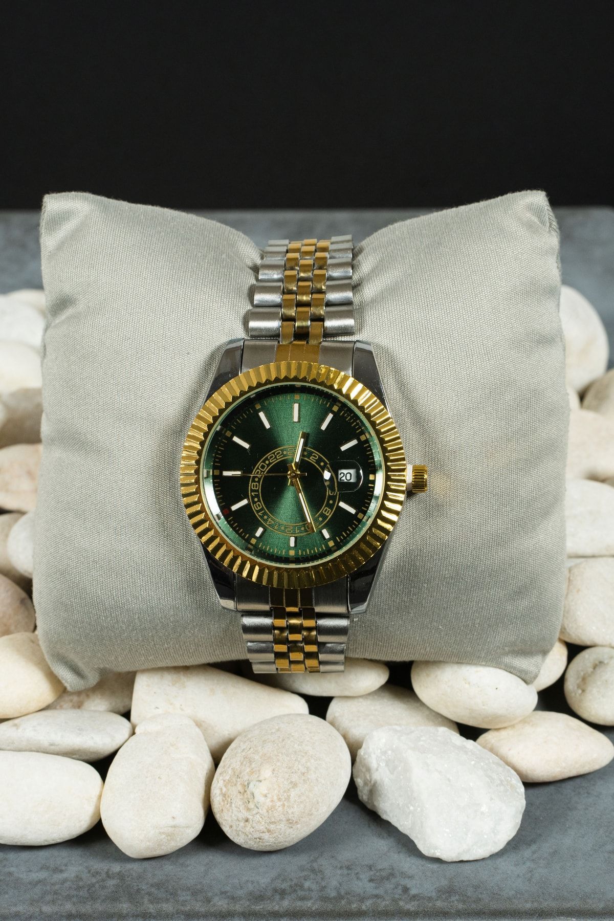 SC Metal Gold Erkek Kol Saati Iç Kasa Bölümü Yeşil Çerçevesi Kordunu Gold Şık Günlük Kol Saati