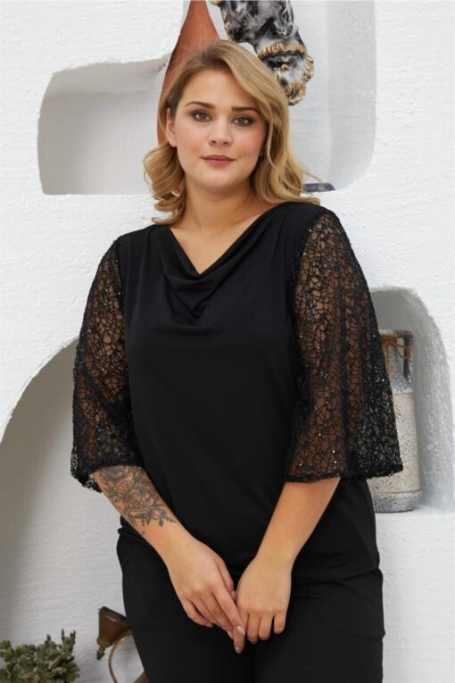 Seamoda Büyük Beden Degaje Yaka Kolu Pul Işlemeli Abiye Bluz-siyah