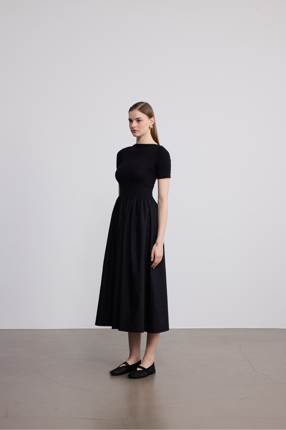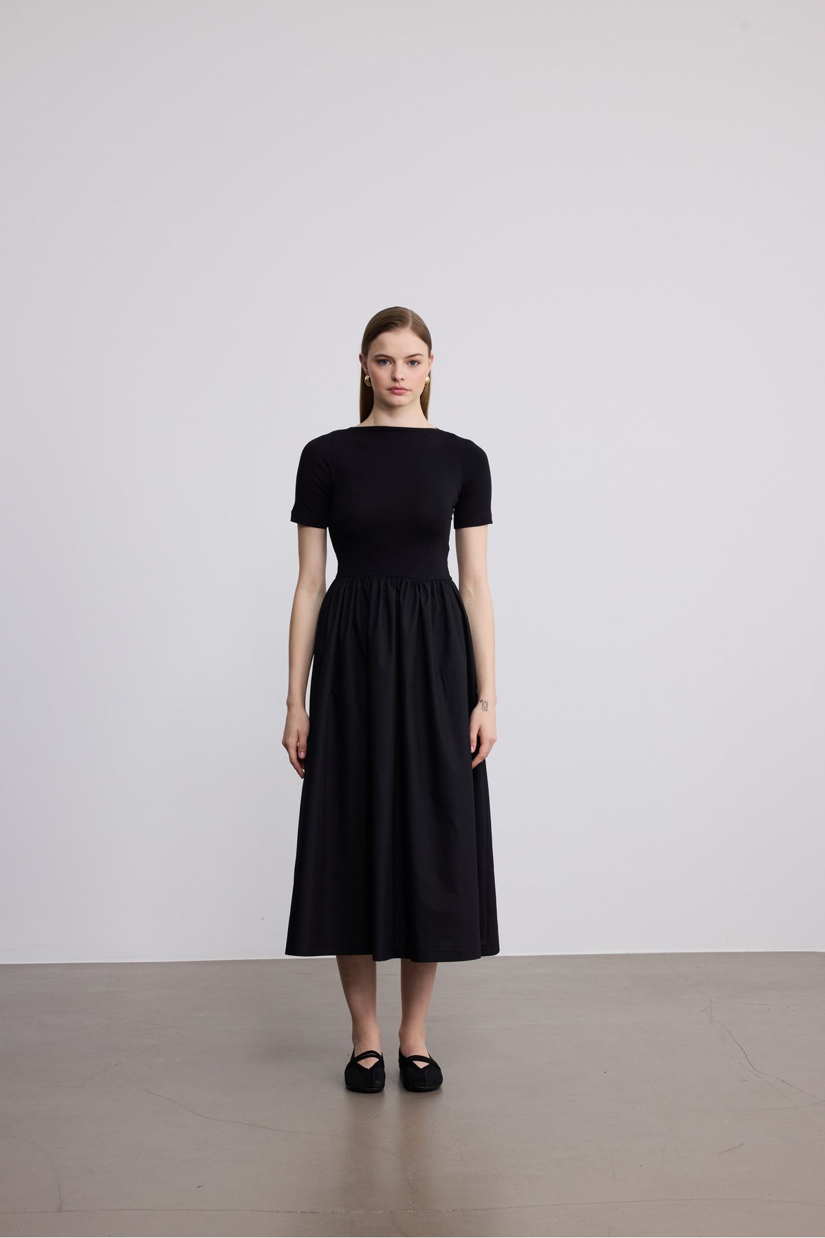 SevdeUgur Kadın Maxi Boy Esnek Örme Üstlü Poplin Etekli Şık Siyah Elbise Kısa Kol / Sevde Ugur