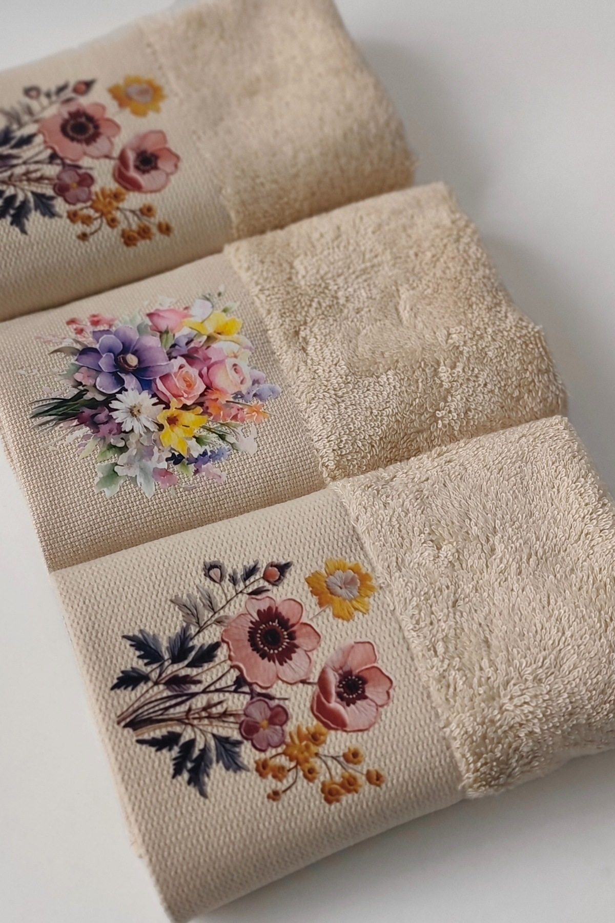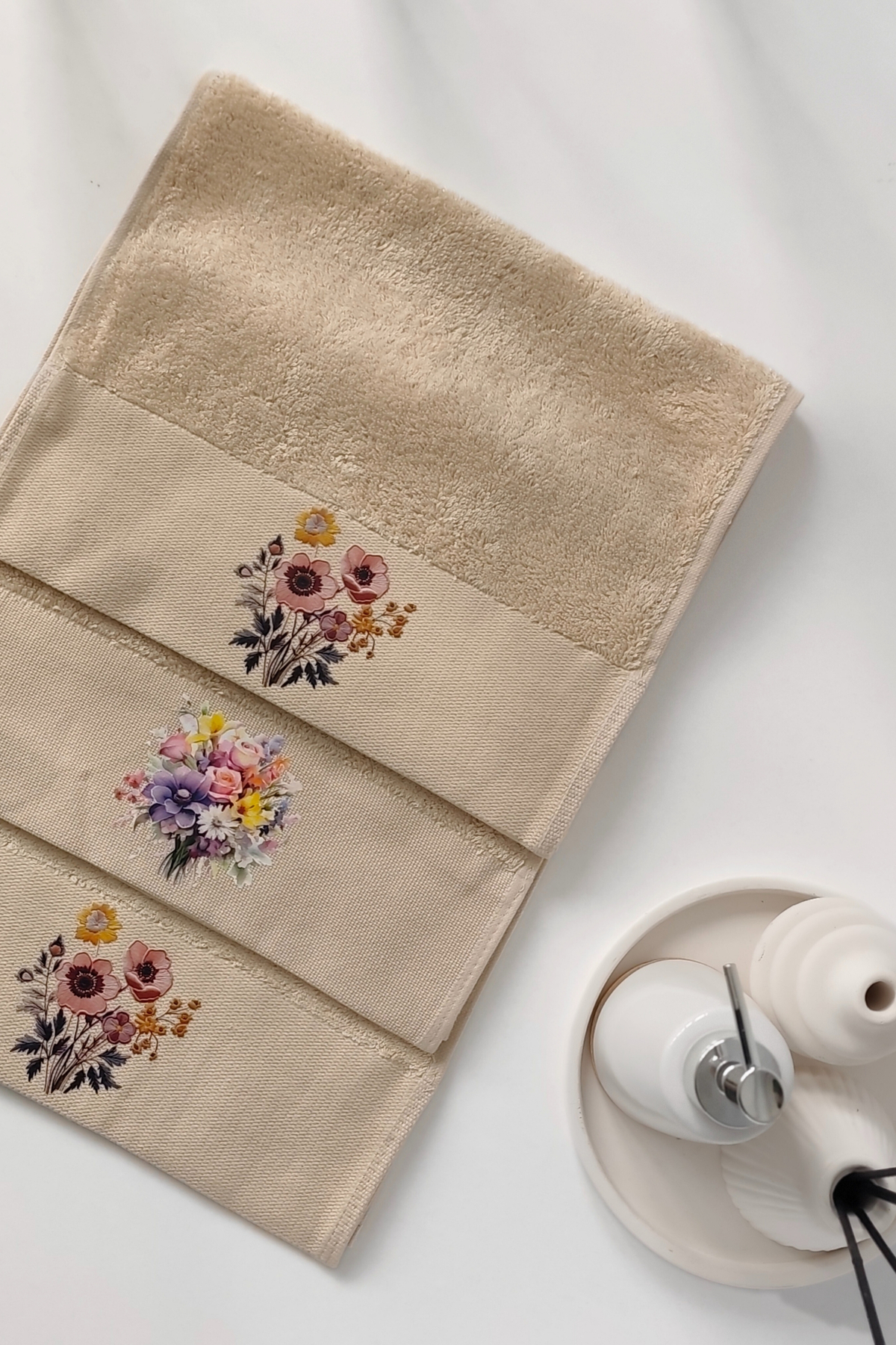 Sevim 3’lü Çiçek Baskılı Havlu Takımı – Bej Renk Bambu El Havlusu Seti – Yumuşak & Süper Emici – 30×50 Cm
