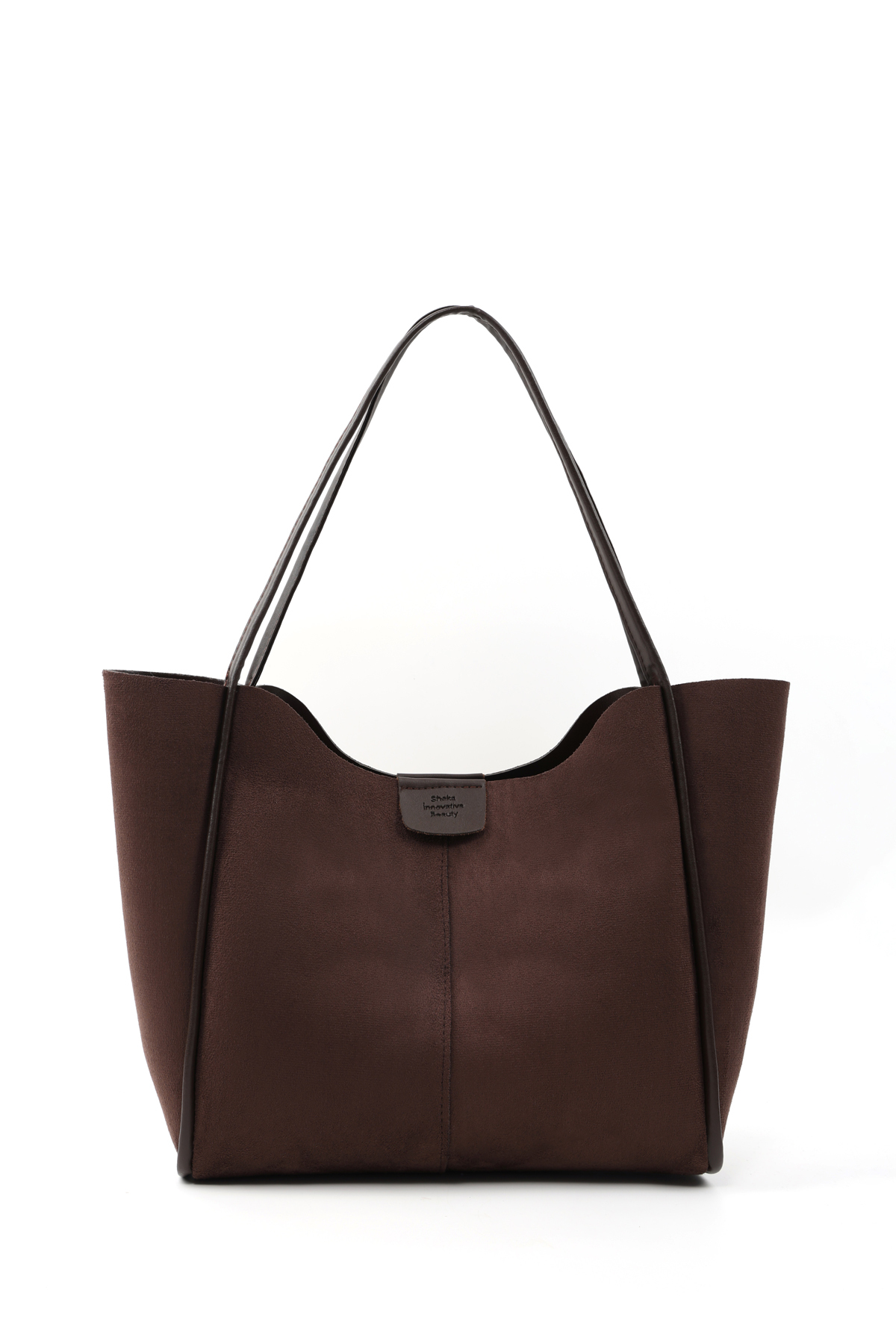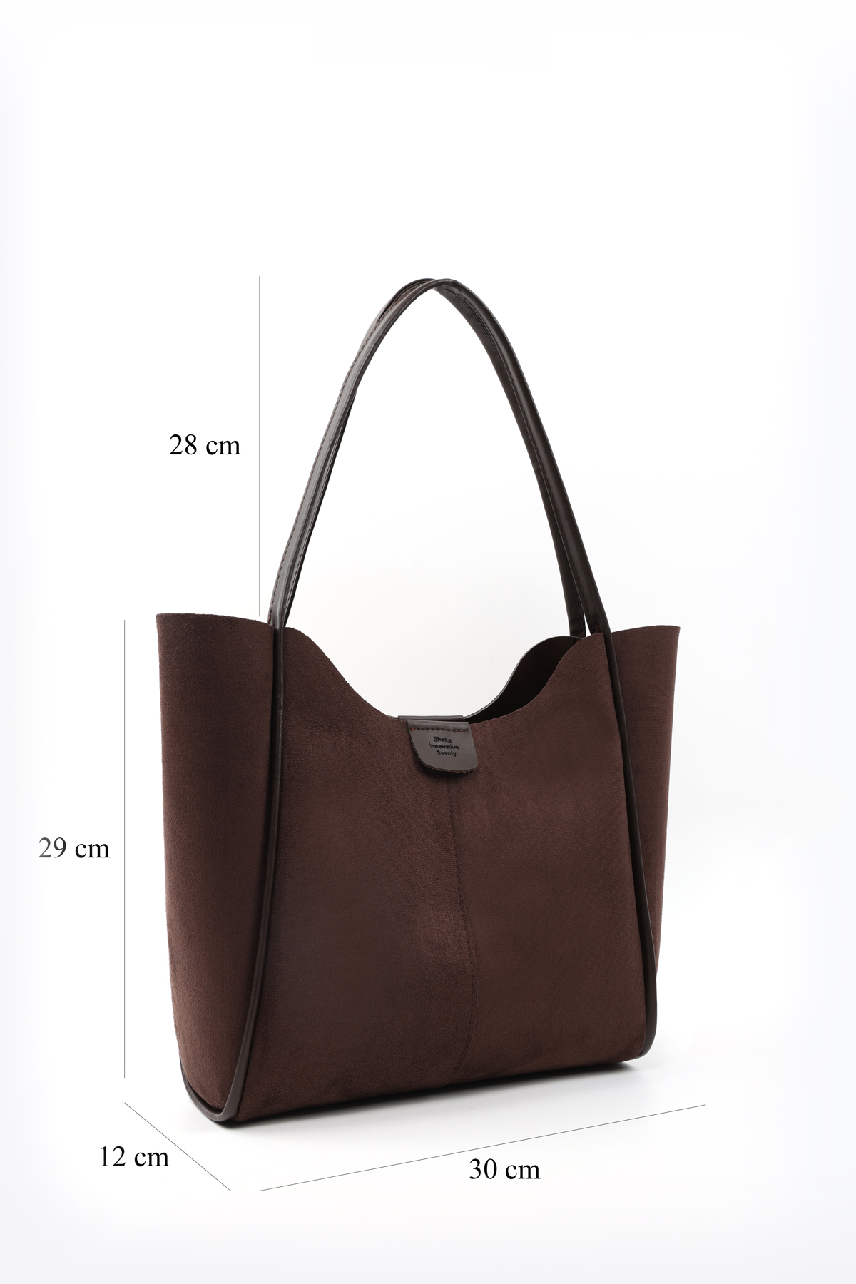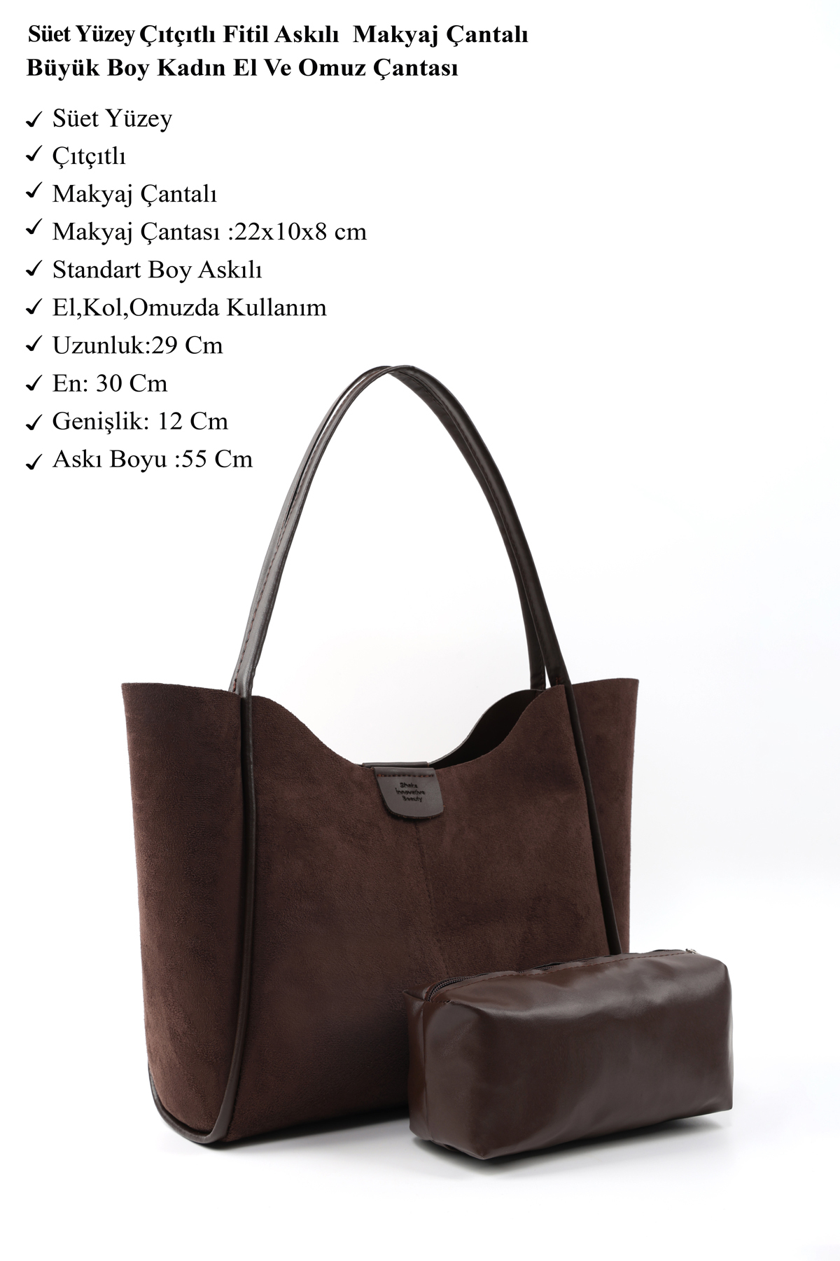 SHAKA Kahverengi Süet Shk76 Çıtçıtlı Fitil Askılı Suni Deri Makyaj Çantalı Büyük Boy Kadın El ve Omuz Çant