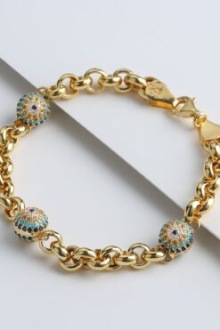 Silvano Jewelry 925 Ayar Gümüş Altın Kaplama Taşlı Göz Nazar Kalın Bileklik