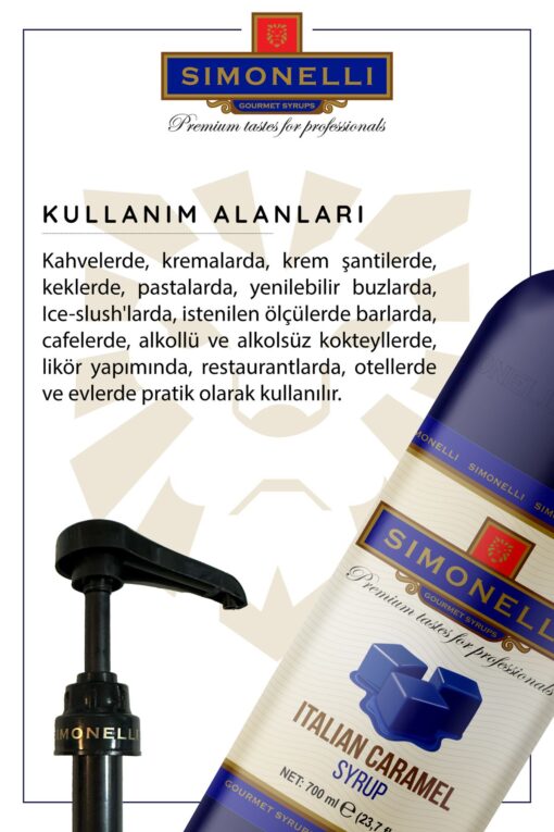 Aroma: İtalyan Karamel Şurup pompası dahildir Kullanım Alanları: Kahvelerde, Kremalarda, Krem Şantilerde, Keklerde, Pastalarda, Yenilebilir Buzlarda, Ice-slush’larda, Istenilen ölçülerde barlarda, cafelerde, Alkollü ve alkolsüz Kokteyllerde, Likör yapımında, Restaurantlarda, Otellerde ve evlerde pratik olarak kullanılır.