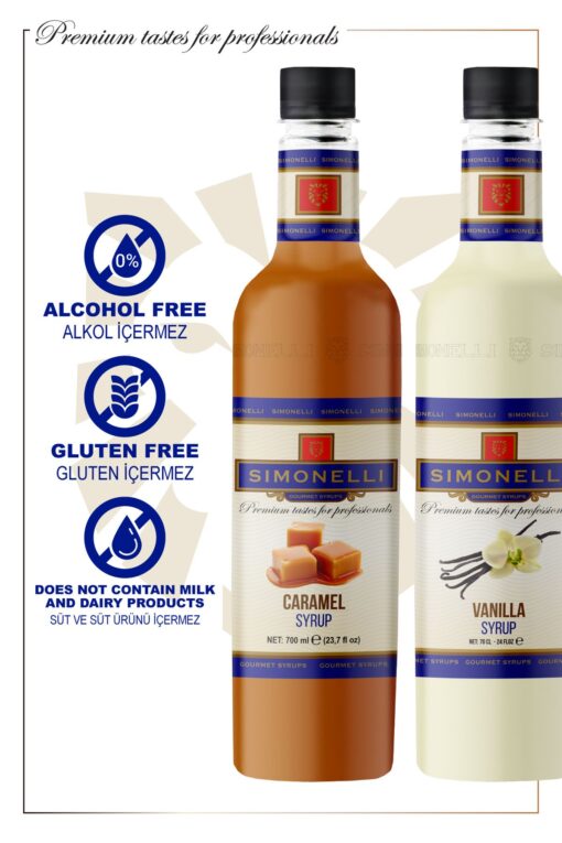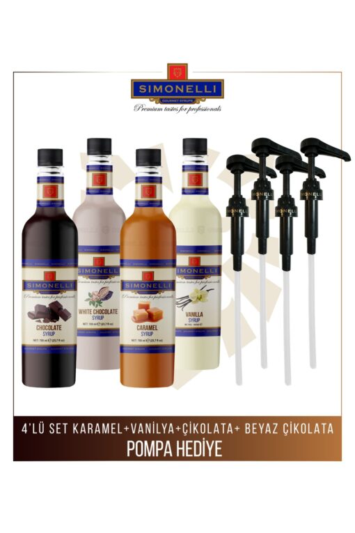 Simonelli Kahve ve Kokteyl Şurubu 700 ml 4’lü Set Karamel+Vanilya+Çikolata+Beyaz Çikolata + 4 Adet Pompa en ucuz fiyata kozmetikara.com sitemizden sipariş verebilirsiniz.