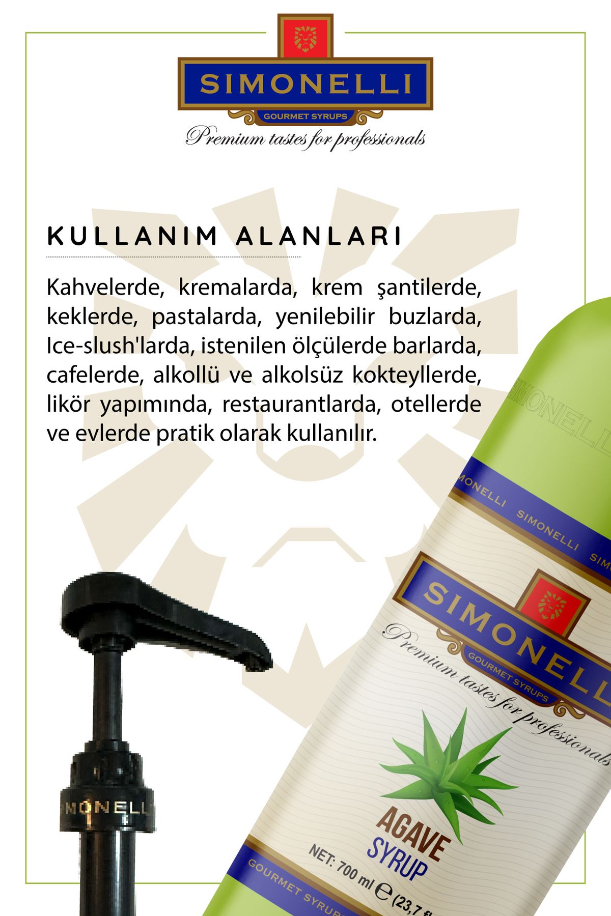 Ürün Aroma: Agave Şurup pompası dahildir Kullanım Alanları: Kahvelerde, Kremalarda, Krem Şantilerde, Keklerde, Pastalarda, Yenilebilir Buzlarda, Ice-slush’larda, Istenilen ölçülerde barlarda, cafelerde, Alkollü ve alkolsüz Kokteyllerde, Likör yapımında, Restaurantlarda, Otellerde ve evlerde pratik olarak kullanılır.