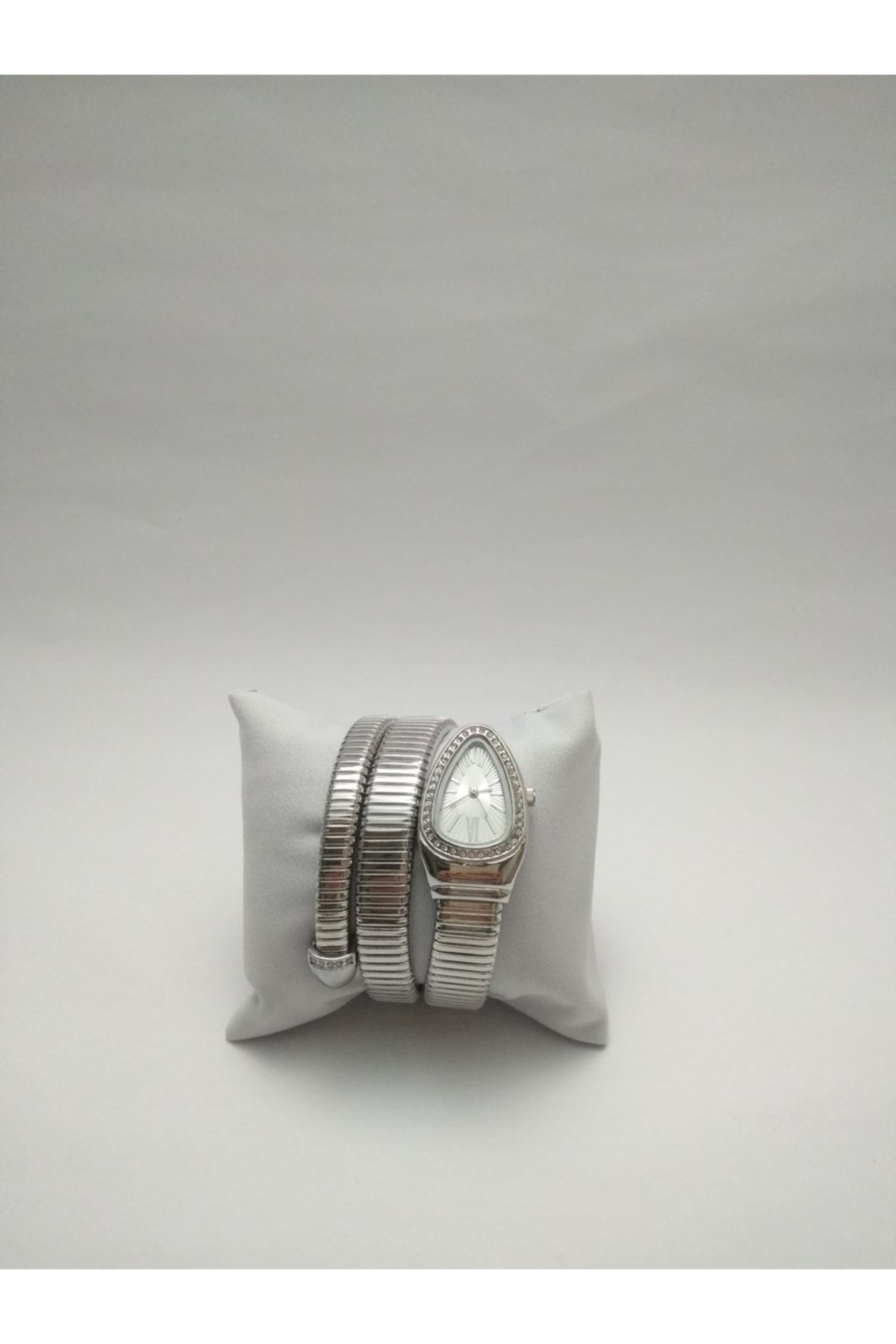 Yılan modeli tasarımı ile dikkat çeken bu şık kadın saati, gümüş rengiyle zarifliği ön plana çıkarır