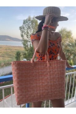 sisa.art Pazar Çantası Plastik Örme Renkli Piknik Sepeti Plaj Çanta