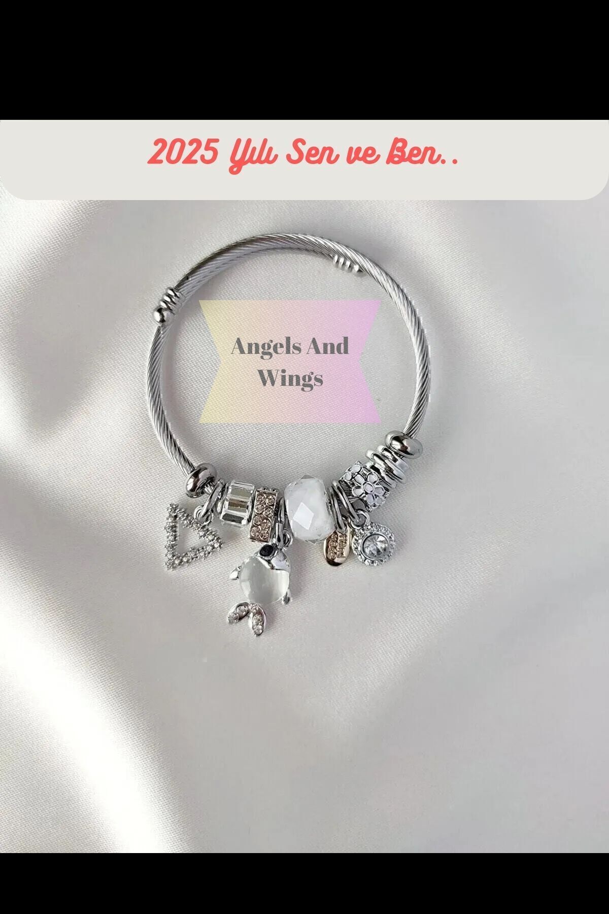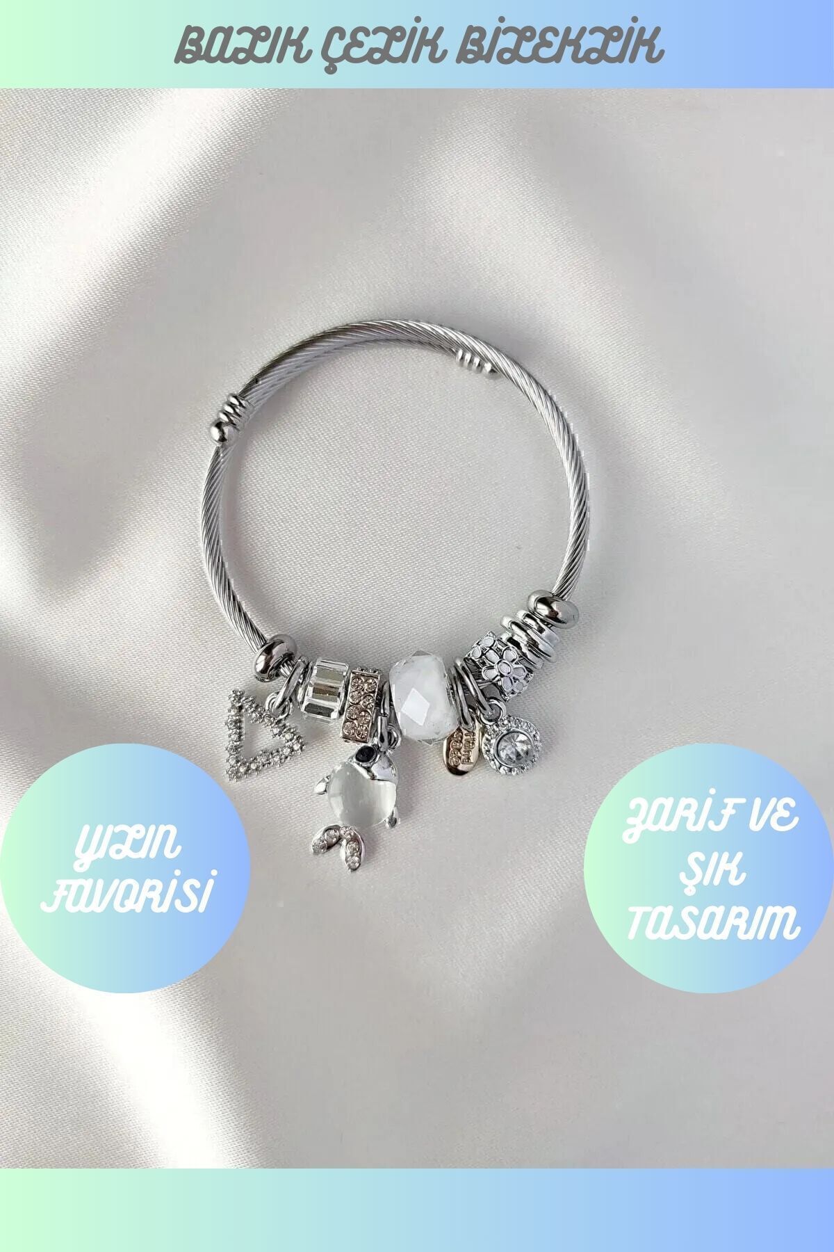 Siyah Kadın Beyaz Balıklı Halkası Charmlı Alaşımlı 316l Paslanmaz Çelik Bileklik