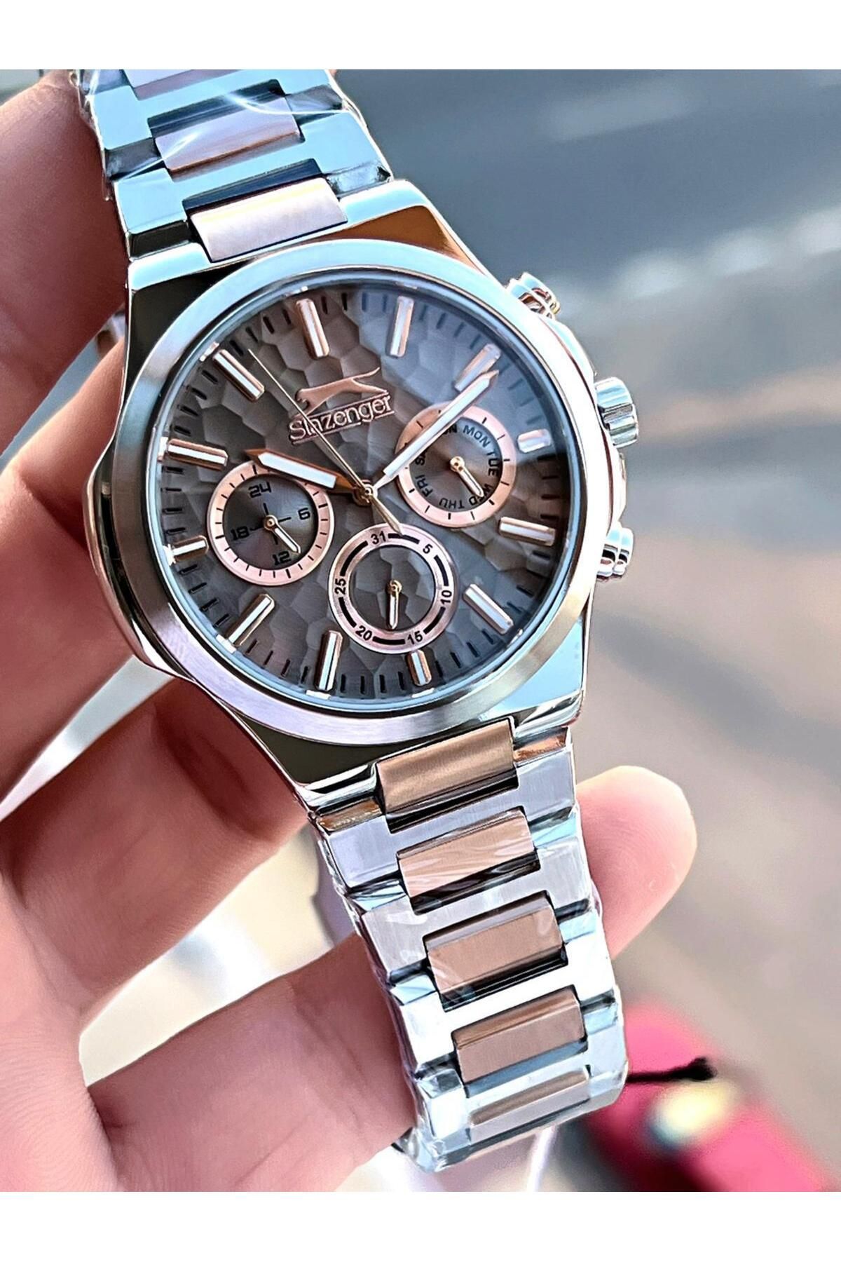 GÜNÜN 12/24 FORMATI) Kadran Rengi:ANTRASİT Kasa Rengi :METALİK GRİ Kordon Rengi :METALİK GRİ/ROSE GOLD Kordon Materyali :ÇELİK (KARARMA RENK ATMA YAPMAK) Kadran Şekli : Yuvarlak Kasa Materyali : İYON KAPLAMA Mekanizma : Pilli Ekran Tipi : ANALOG Cam : CİZİLMEYE DAYANIKLI MİNERAL CAM Suya Dayanıklılığı :ERKEK 5 ATM Suya Dayanıklılığı :KADIN 3 ATM Kronometre : YOK Marka : SLAZENGER ERKEK KASA ÇAPI : 44