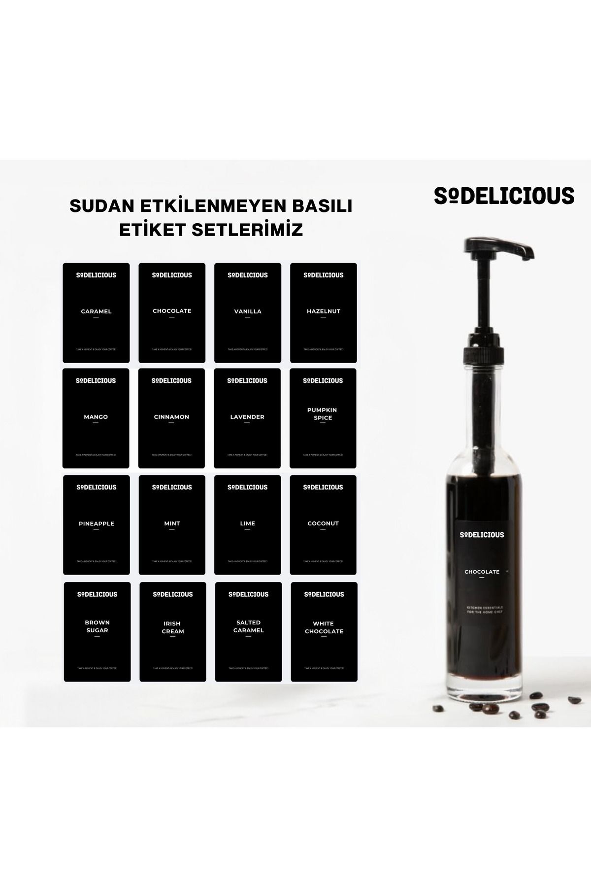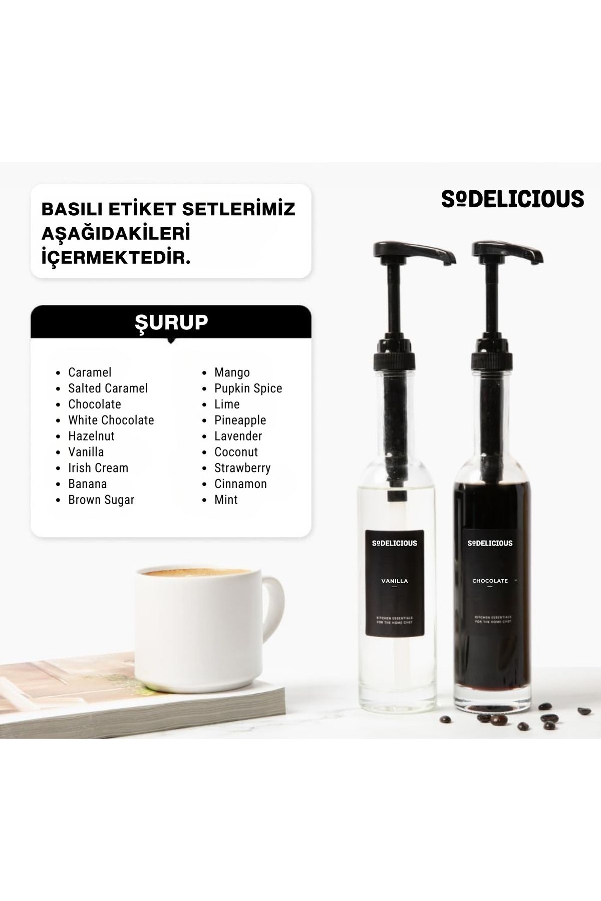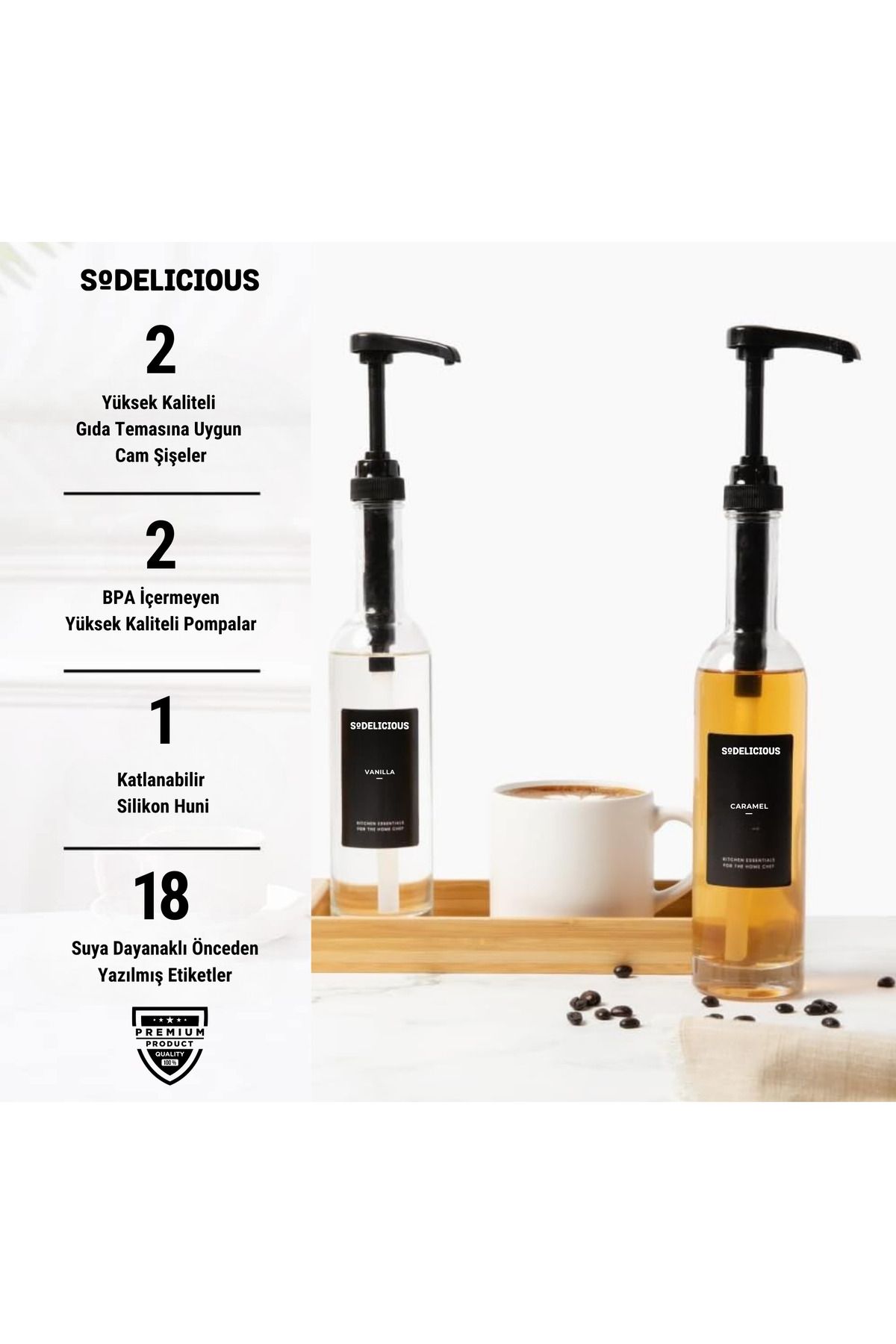SODELICIOUS COFFEE TEA 2’li Set | 250ml Pompalı Cam Şurup Şişesi- Kahve , 18 Çeşit Siyah Etiket + Silikon Huni Hediyeli