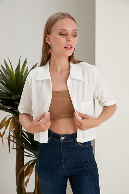 Space Fashion Kadın Beyaz Crop Bürümcük Kumaş Düğmeli Cepli Gömlek