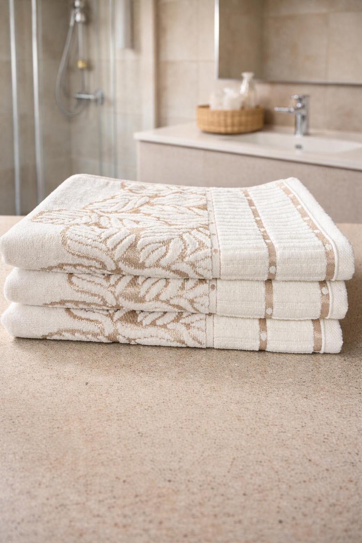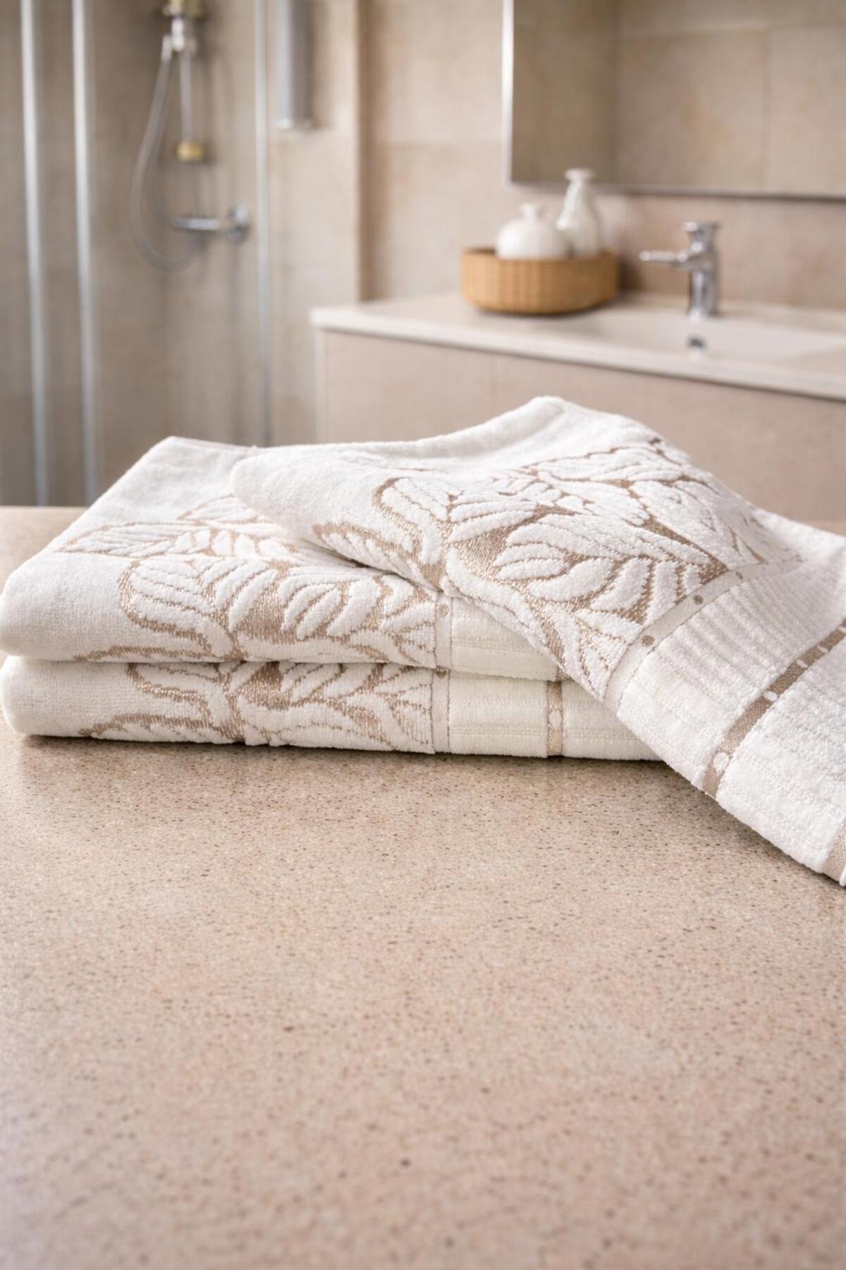 S&R 3 Adet Çeyizlik El-Yüz Havlusu Jakarlı Kadife Yaprak Desen