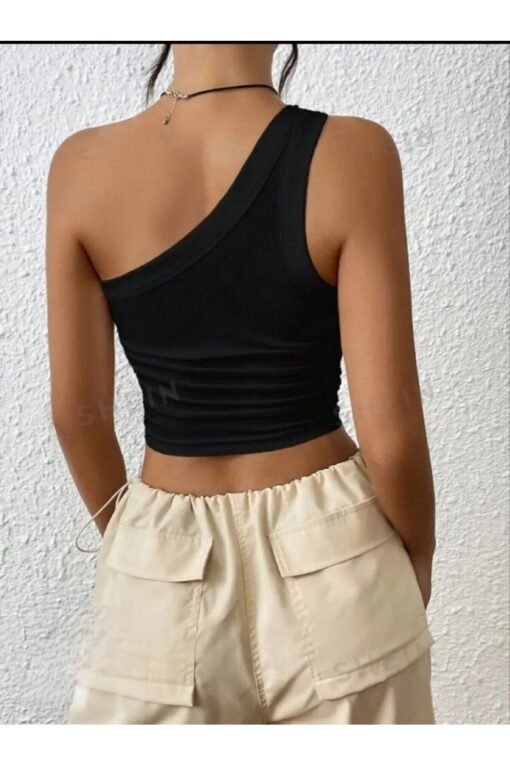 Stail Moda Kadın Siyah Tek Omuz Asimetrik Yaka Crop Büstiyer Kaşkorsa Omuz Crop Büstiyer Omuz Kadın Büstiyer
