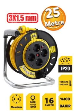 Stanley Seyyar %100 Bakır 25 Metre 3×2.5 Mm 4 Prizli Plastik Makaralı Uzatma Elektrikli Araç Kablosu H05vv-f