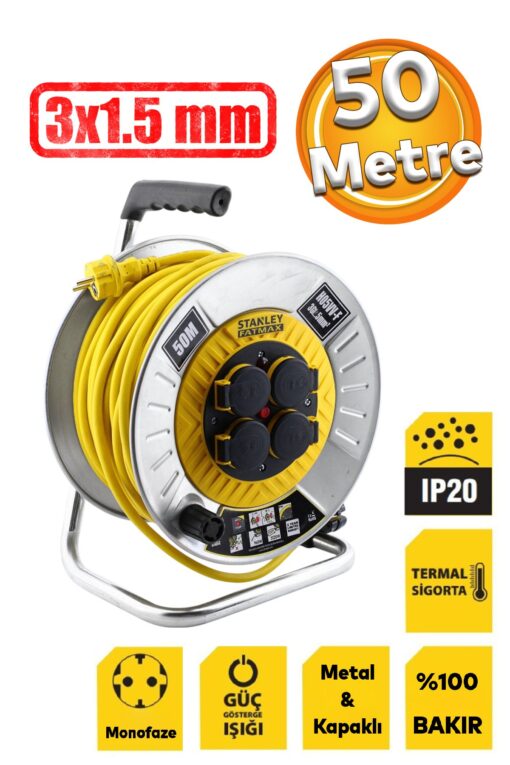 Stanley %100 Bakır Kablo Metal Makaralı 50 Metre Seyyar 4 Prizli Kapaklı Uzatma Kablosu 3x1.5 mm H05VV-F ürünü ucuz fiyat, hızlı kargo ve kredi kartına 12 ay taksit imkanı ile hemen sitemizden sipariş verin.