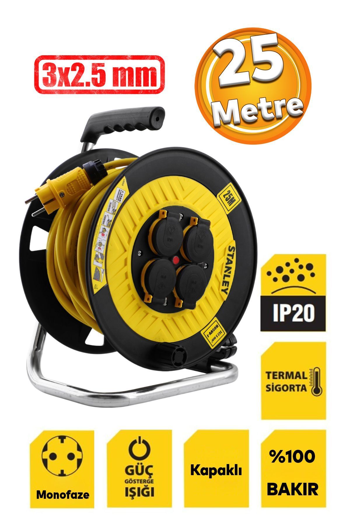 Stanley Seyyar %100 Bakır 25 Metre 3x2.5 Mm 4 Prizli Plastik Makaralı Uzatma Elektrikli Araç Kablosu H05vv-f ürünü ucuz fiyat, hızlı kargo ve kredi kartına 12 ay taksit imkanı ile hemen sitemizden sipariş verin.