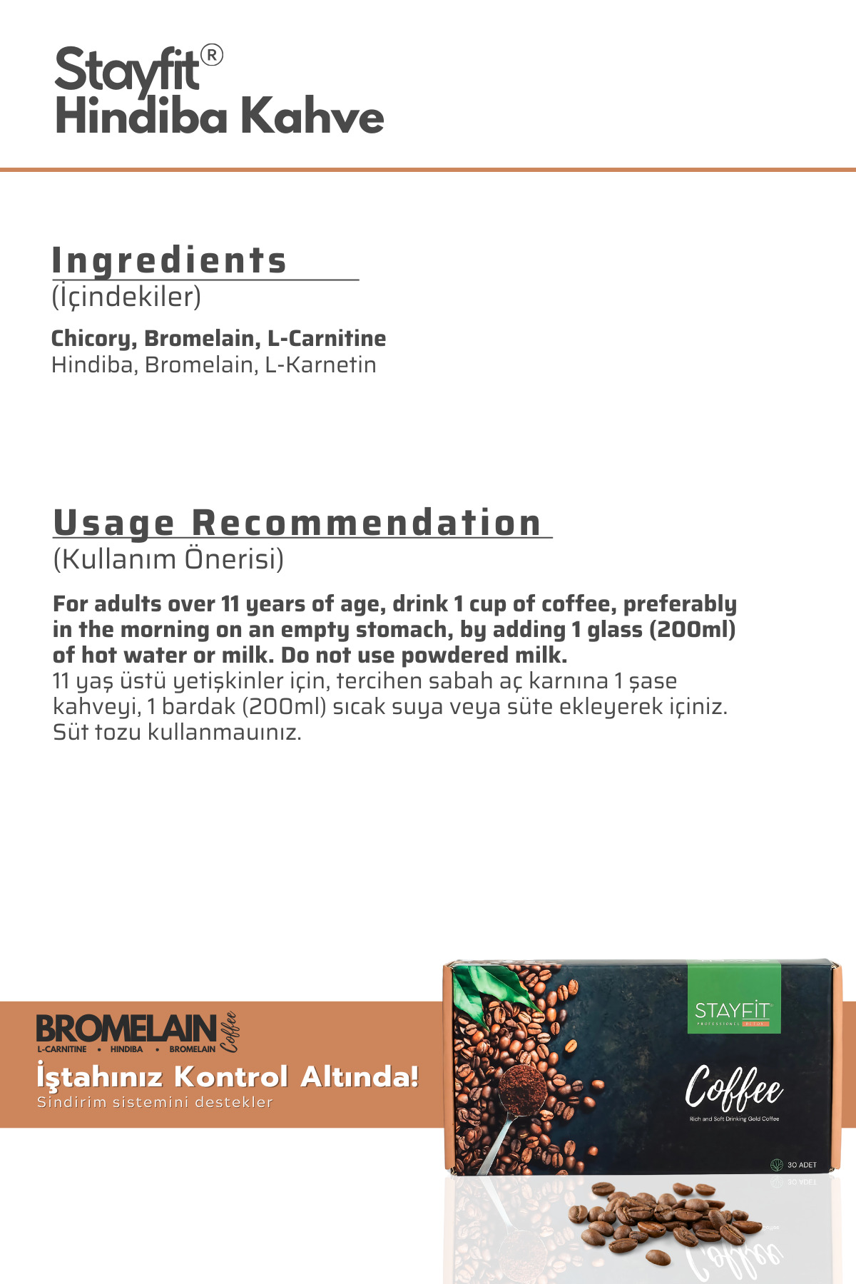 STAYFİT 30 Günlük Hindiba Kahve – 500 Mg Bromelain 2400 Gdu – L-carnitine Takviyeli