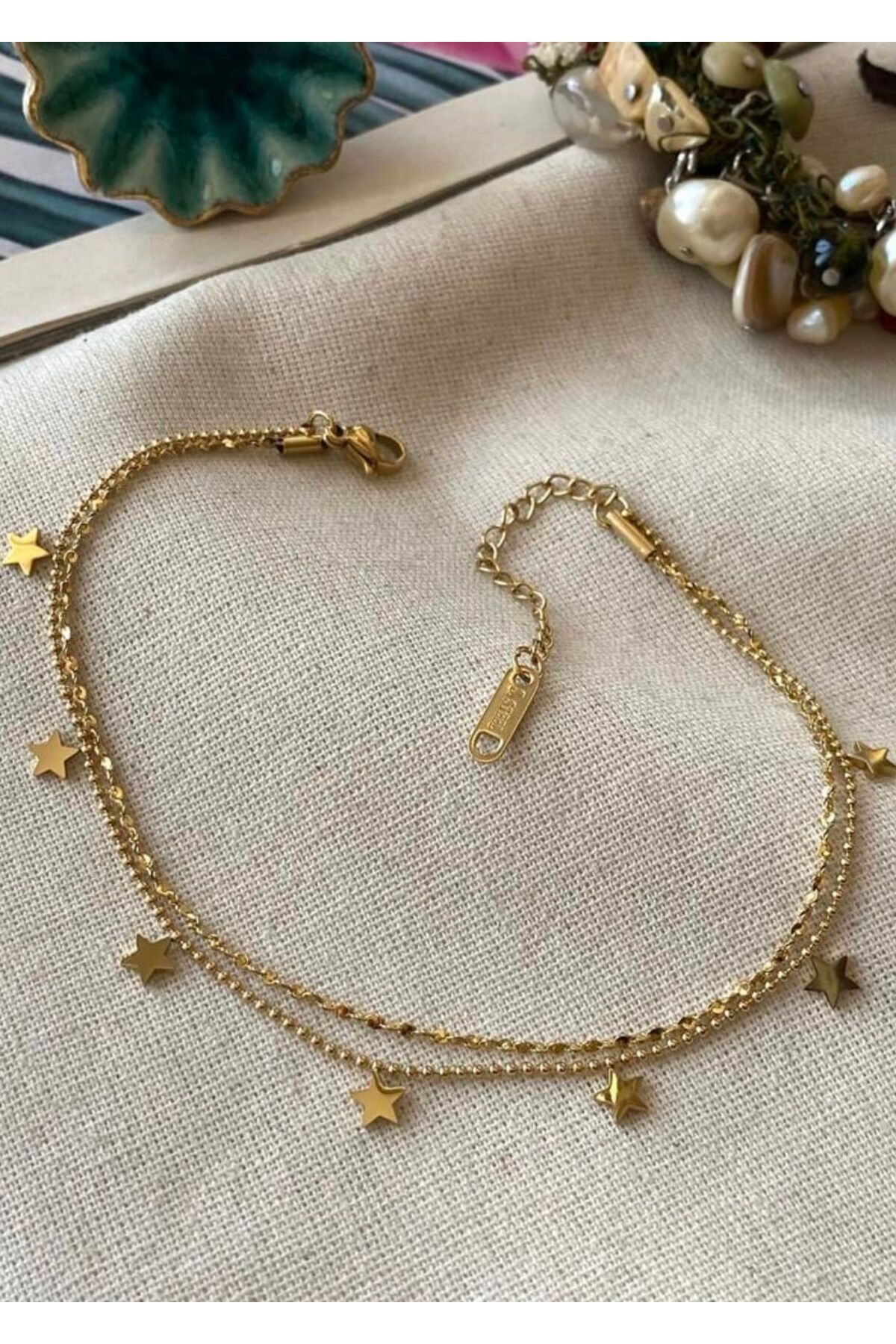 SU PERİSİ TAKI BİJUTERİ Çelik Gold Dorika Zincir Detaylı 2 Sıralı Yıldız Halhal