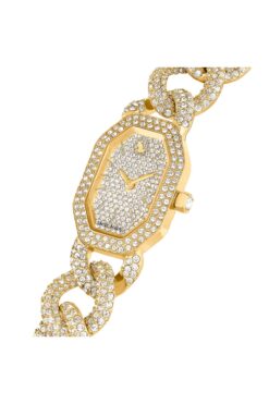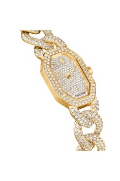 Saat, 530 adet kristalle süslenen ayarlanabilir gurme bir zincirle bileğinizi sararken tekli kristal ise kurma koluna yerleştirilmiştir.