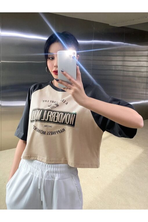 Sweetline Wonderful Mood Süprem Crop T-Shirt – Bej Beyaz Baskılı Oversize Bisiklet Yaka Tişört
