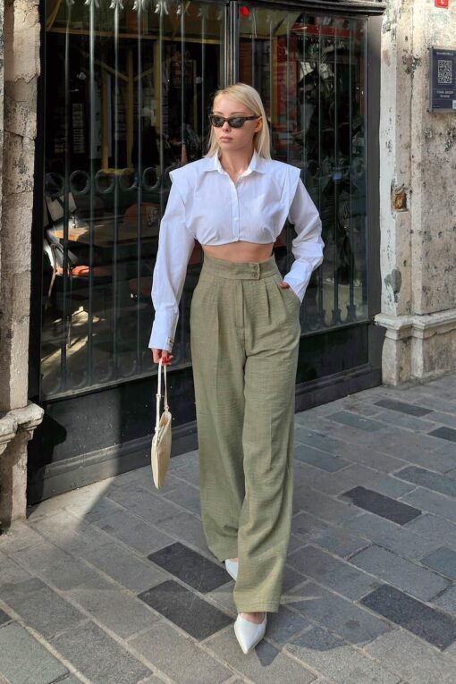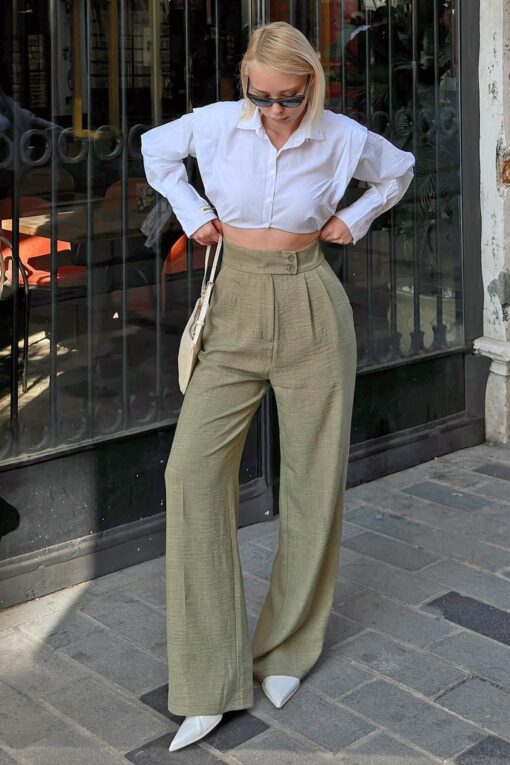 Swist Haki Çift Düğmeli Pileli Kadın Palazzo Keten Pantolon Fiyatları, Özellikleri ve Yorumları