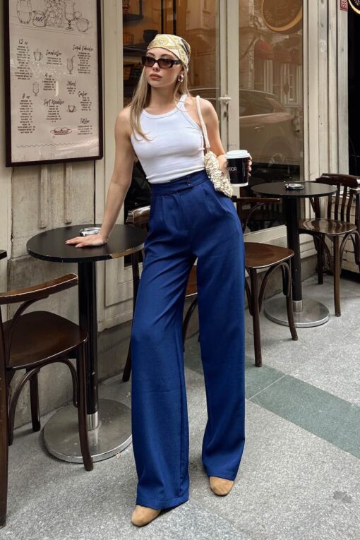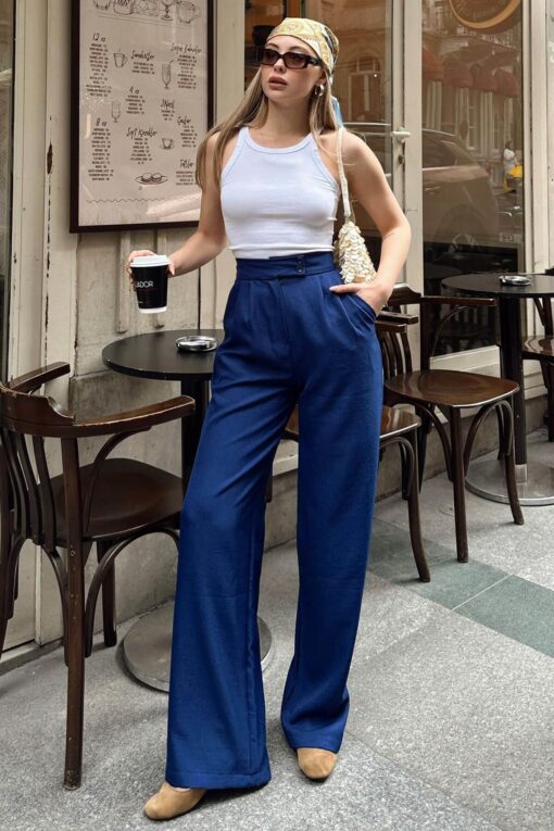 Swist Lacivert Çift Düğmeli Pileli Kadın Palazzo Keten Pantolon en ucuz fiyata kozmetikara.com sitemizden sipariş verebilirsiniz.