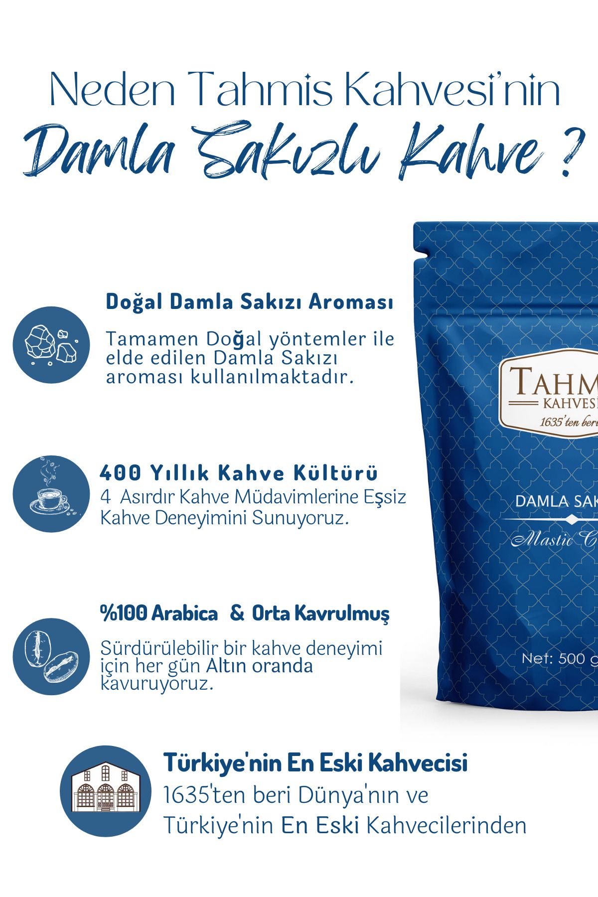 Geleneksel Türk yapımı ve özel yöntemler ile ürettiğimiz Tahmis Damla Sakızlı Aromalı Türk Kahvesi ile sizi 400 yıllık bir yolculuğa çıkartıyoruz
