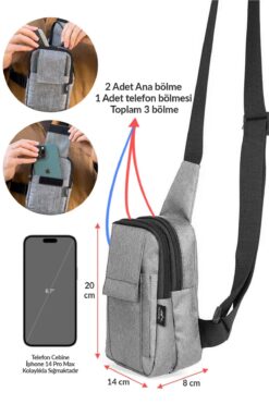 Telefon bölmesi ve 2 ana bölme den oluşmaktadır. Ergonomik ayarlanabilir omuz askı mevcuttur. Kumaşı su geçirmezdir.