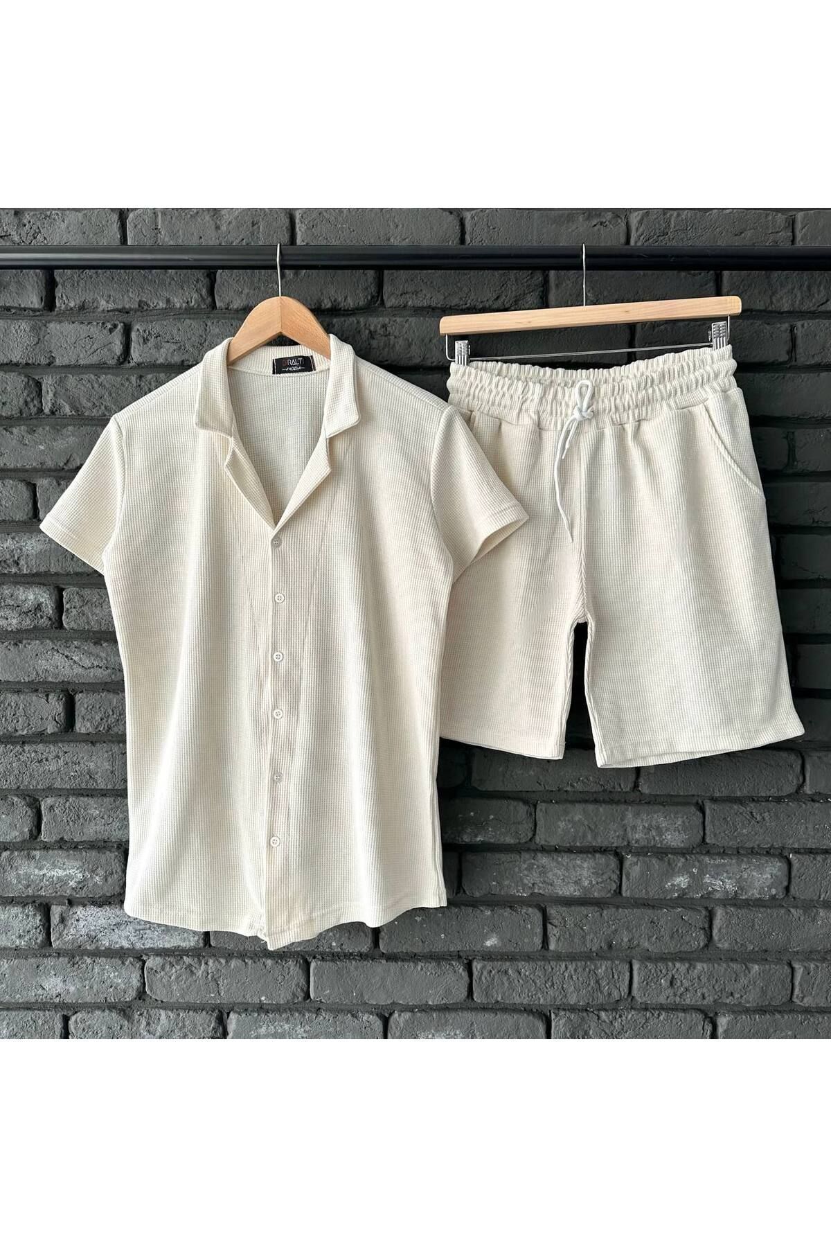 tetramoda Ekru Waffle Kumaş Kısa Kol Gömlek ve Şort Takımı