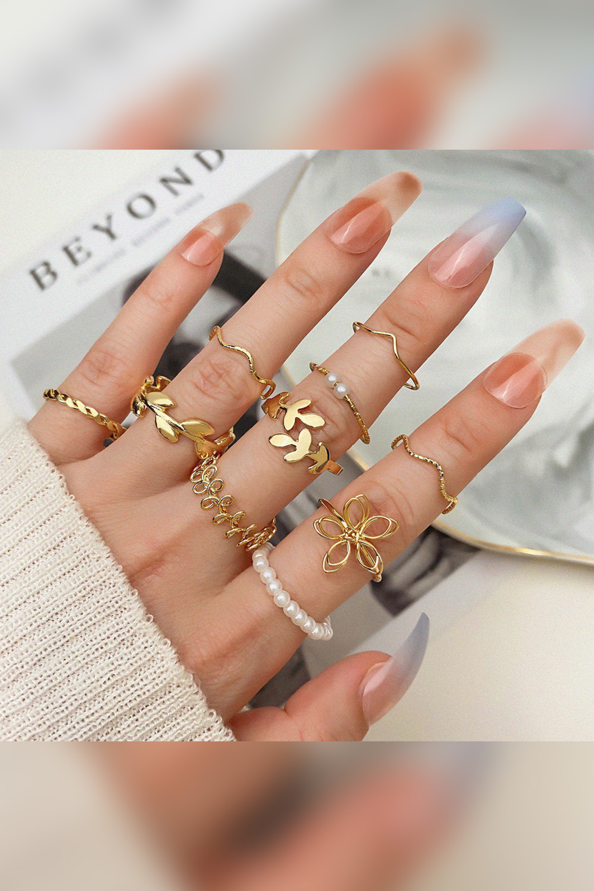 The Collection 10’lu Kombin Eklem Gold İncili Yüzük Set