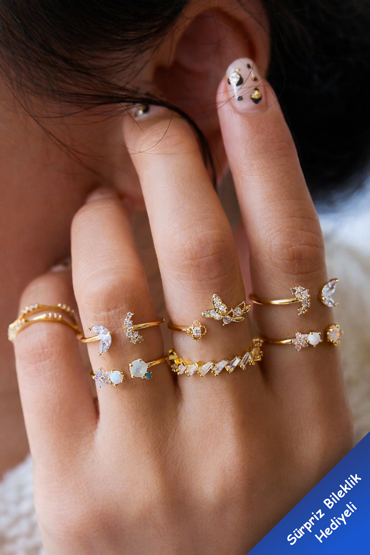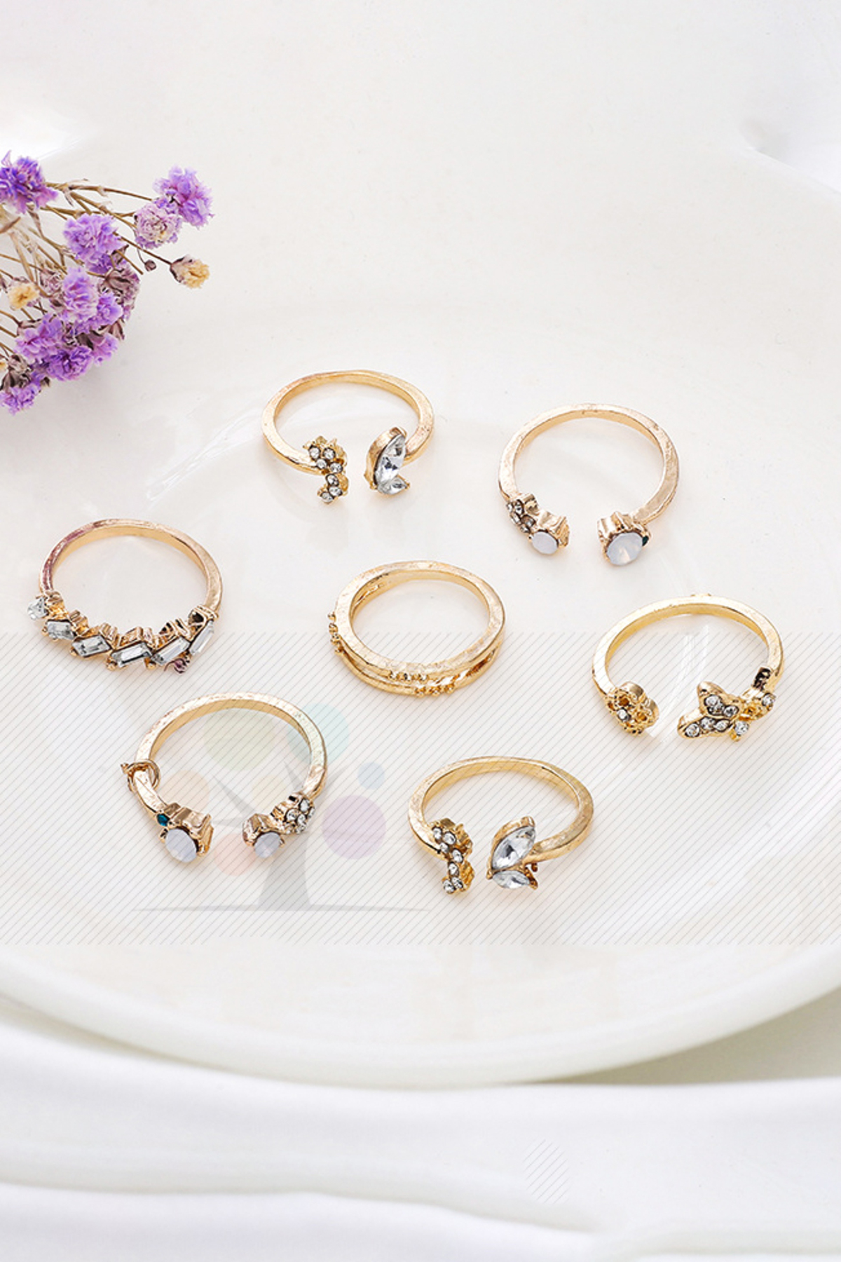 The Collection 7’li Minimal Ay Kelebek ve Çiçek Detaylı Gold Yüzük Seti