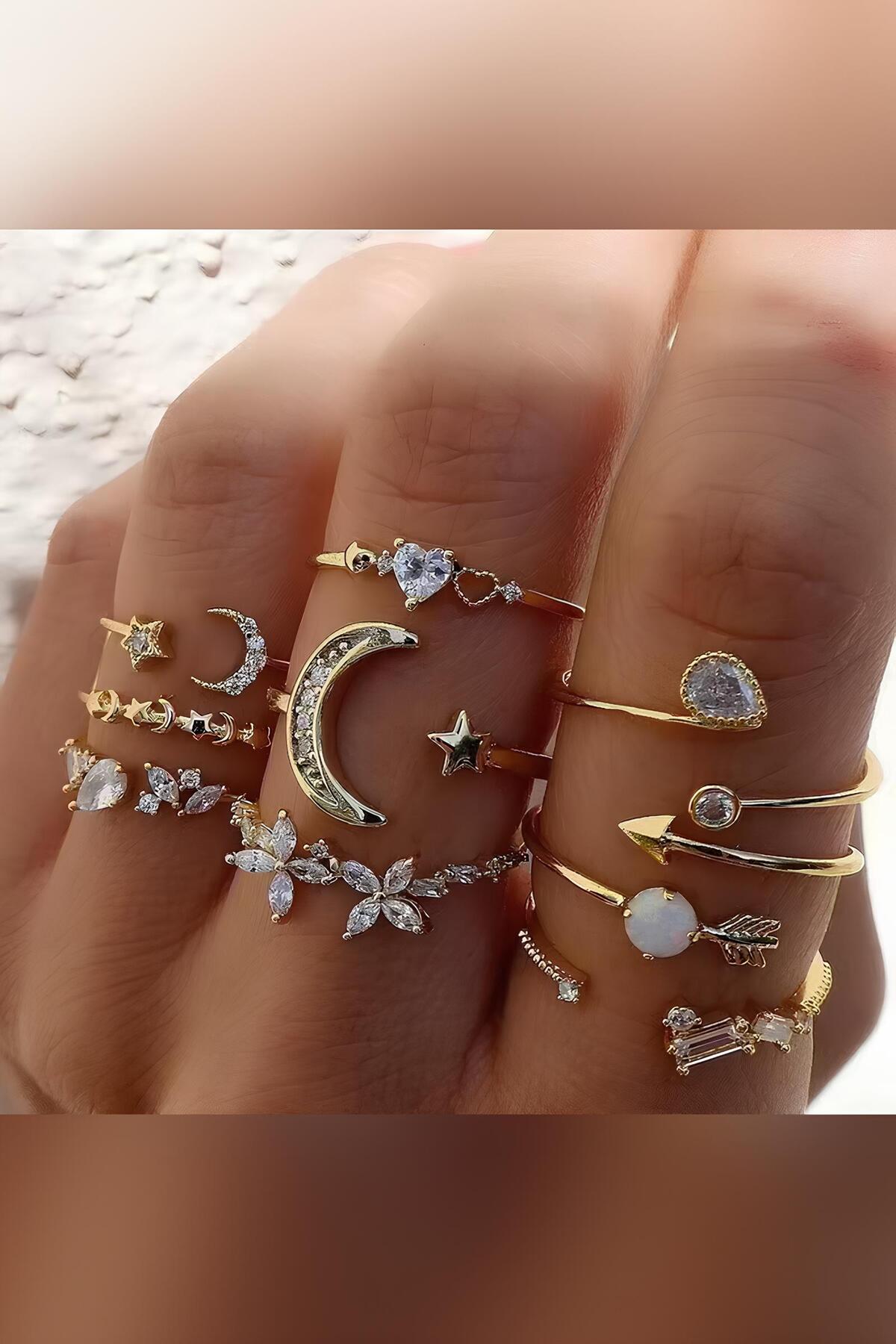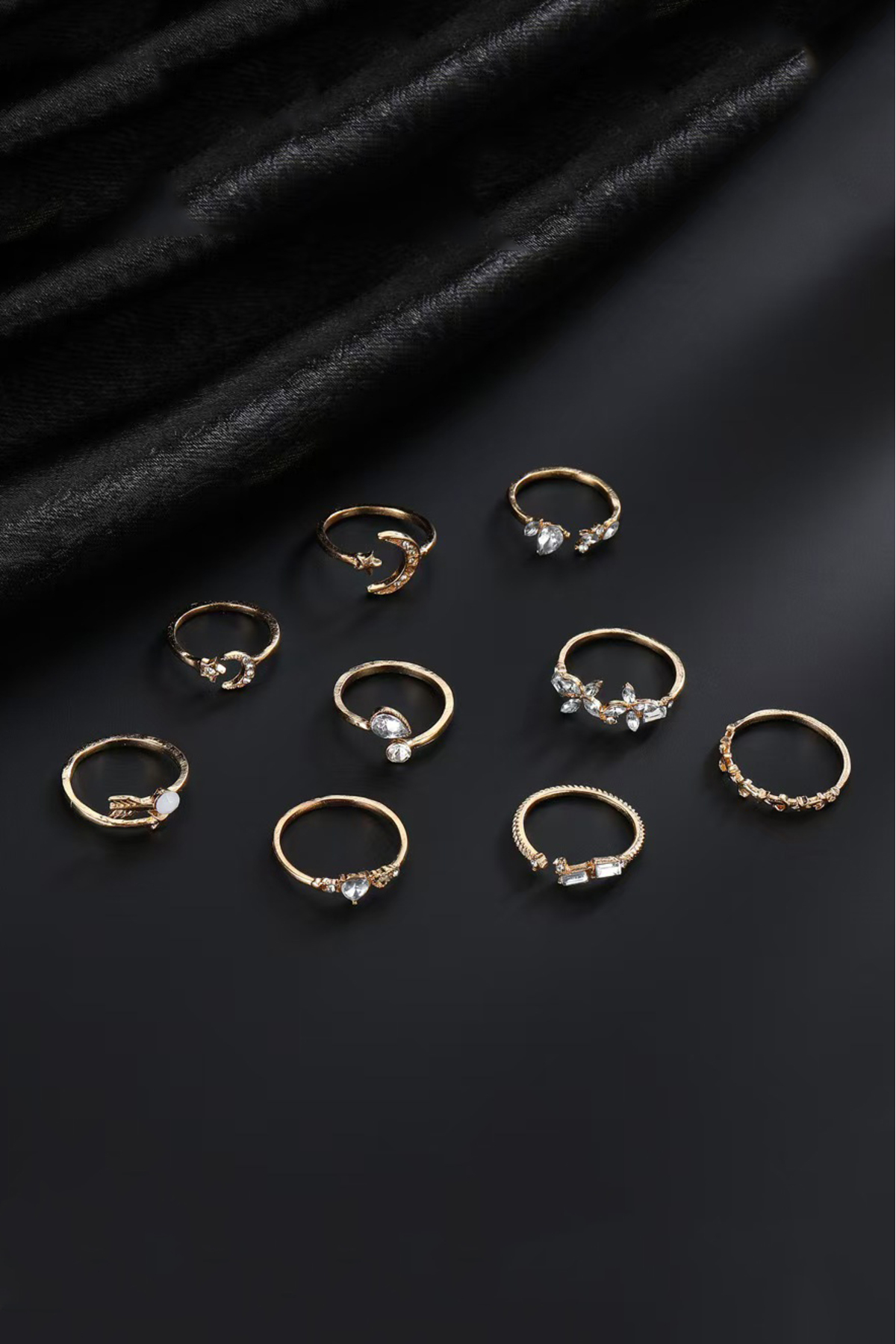 The Collection 9’lu Taşlı Kombin Ay yıldız kelebek ok kalp Tasarım Gold Yüzük Set