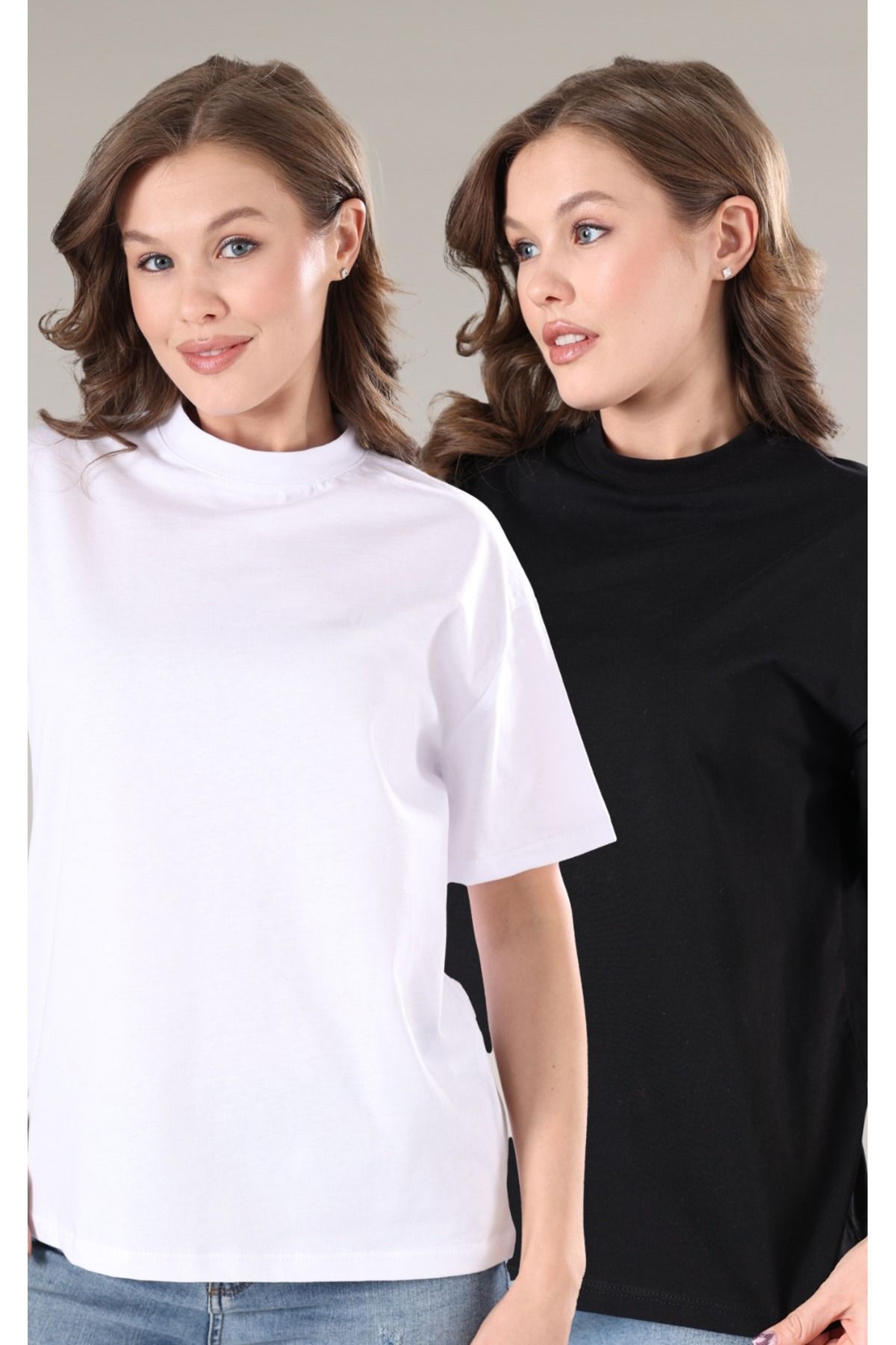 Tight Lady Siyah-Beyaz 2’li Paket %100 Organik Pamuk Basic Ribana’lı Dik Yaka Örme T-Shirt