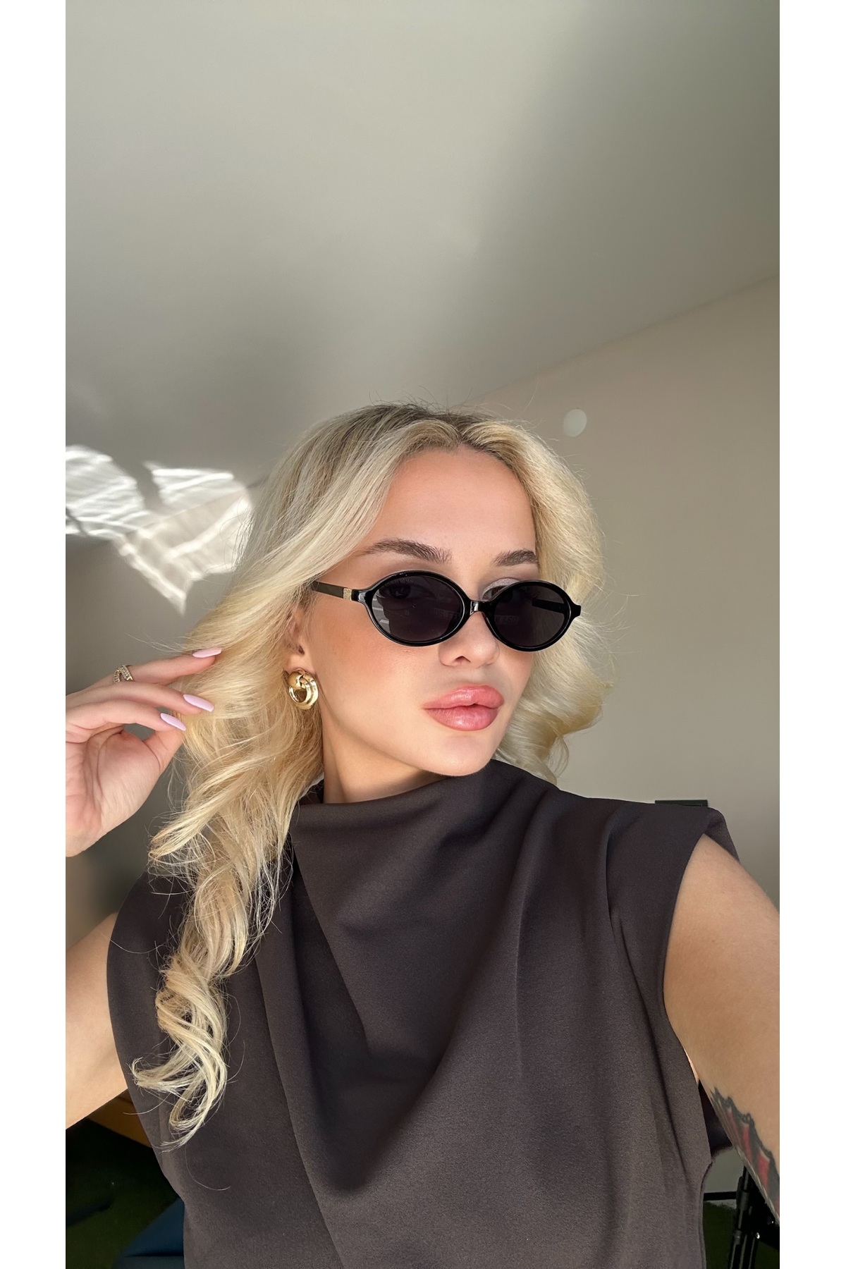 Chunky Frame Kemik Round Oval Unisex Siyah Metal Sap Güneş Gözlüğü