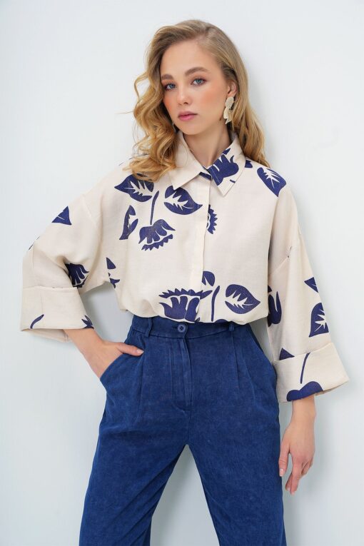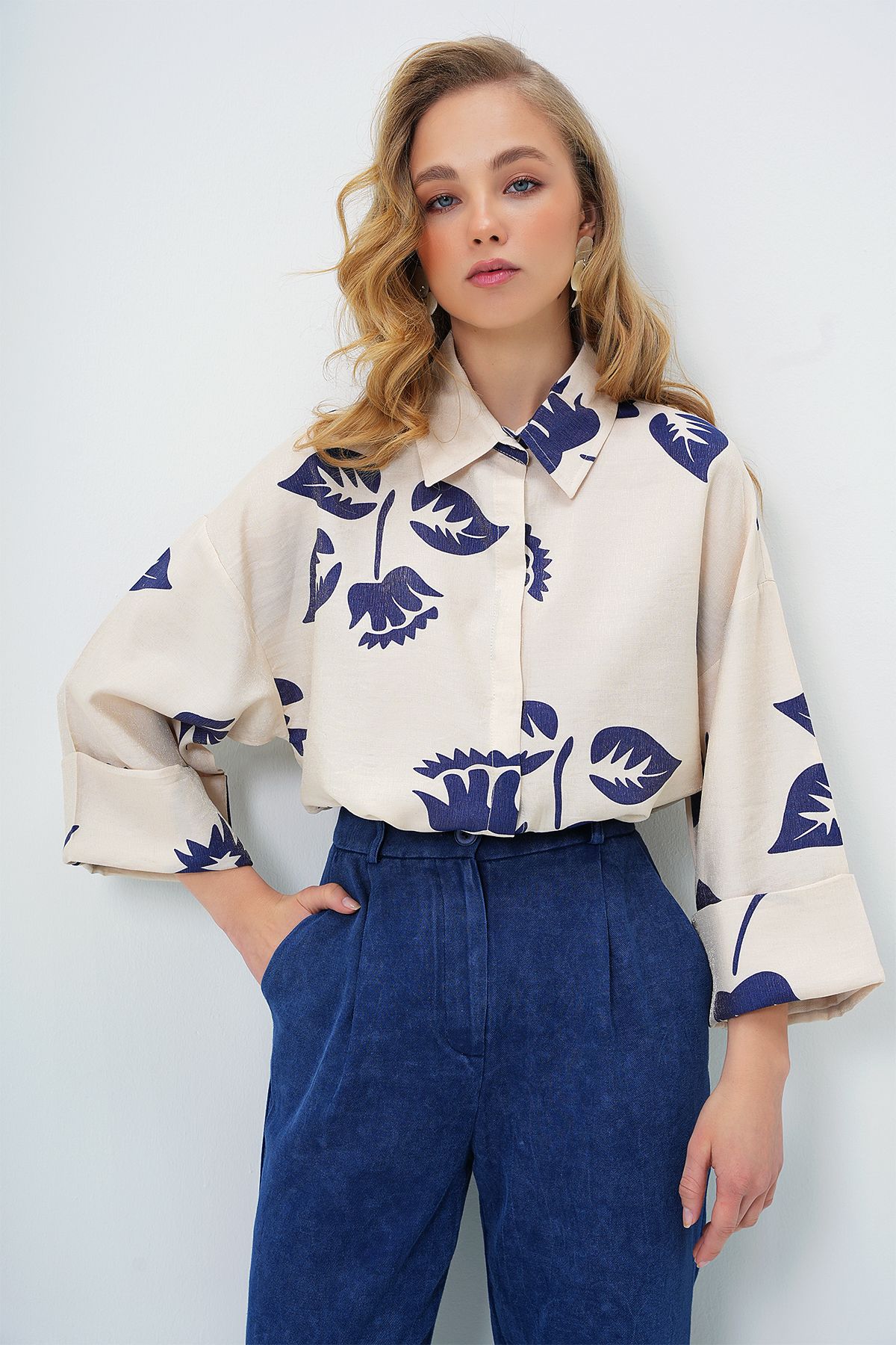Trend Alaçatı Stili Kadın Lacivert-Bej Double Manşetli Yaprak Desenli Dokuma Gömlek ALC-X13785 Fiyatları, Özellikleri ve Yorumları