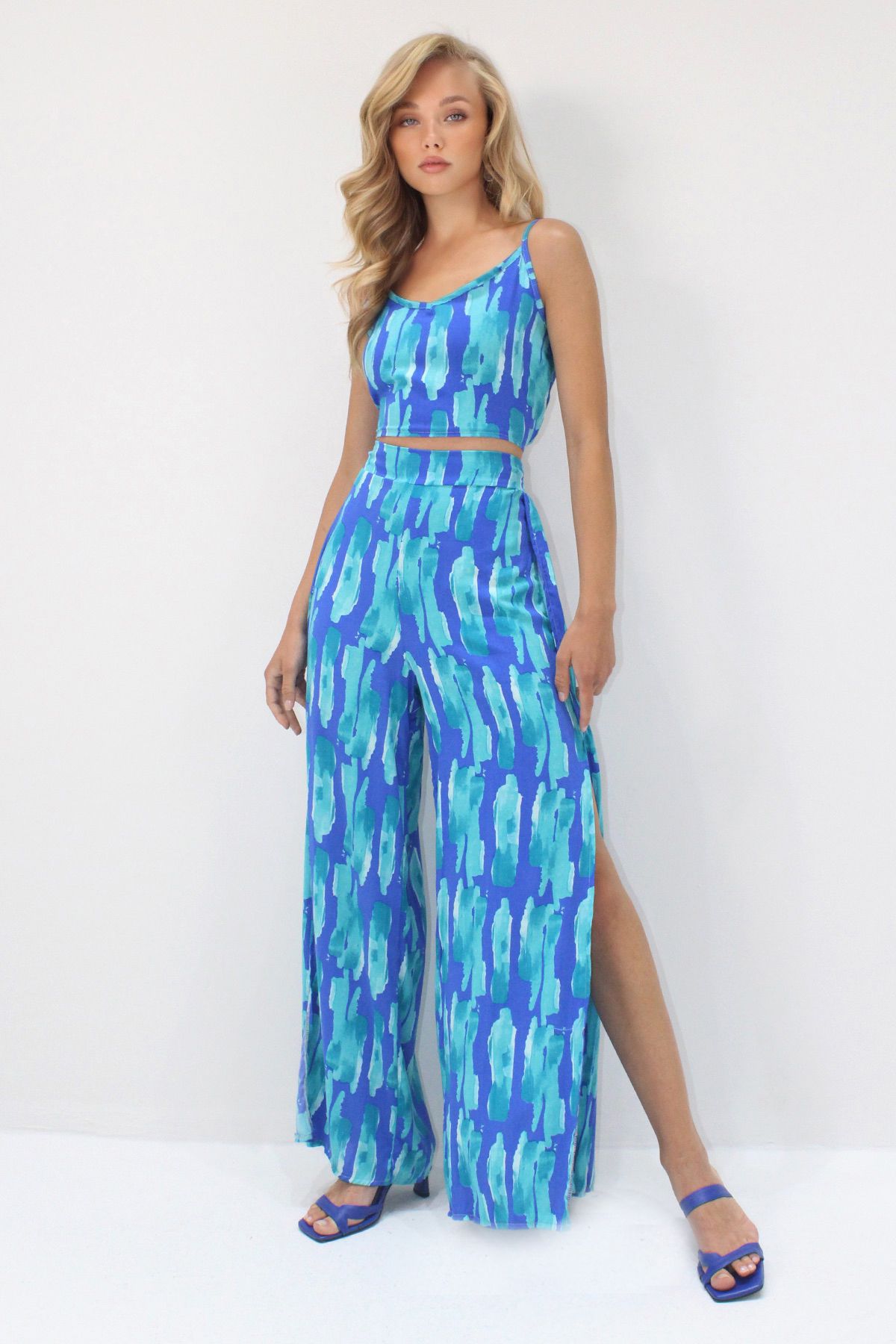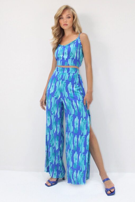 Trend Alaçatı Stili Kadın Mavi Ayarlanabilir Askılı Dokuma Viskon Crop Bluz Ve Yırtmaçlı Pantolon Takım ALC-X14217