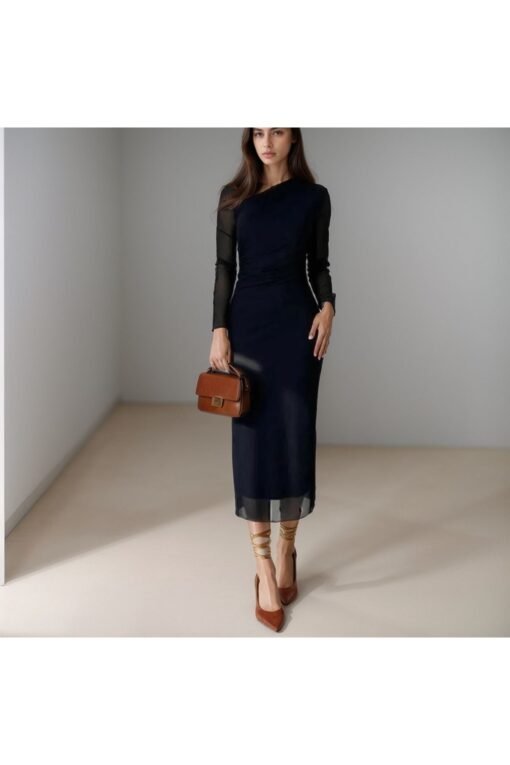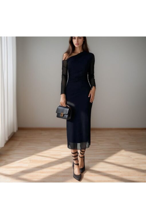Trendusfashion Siyah Tek Omuz Uzun Kollu Şifon Detaylı Midi Elbise – Zarif Gece Elbisesi