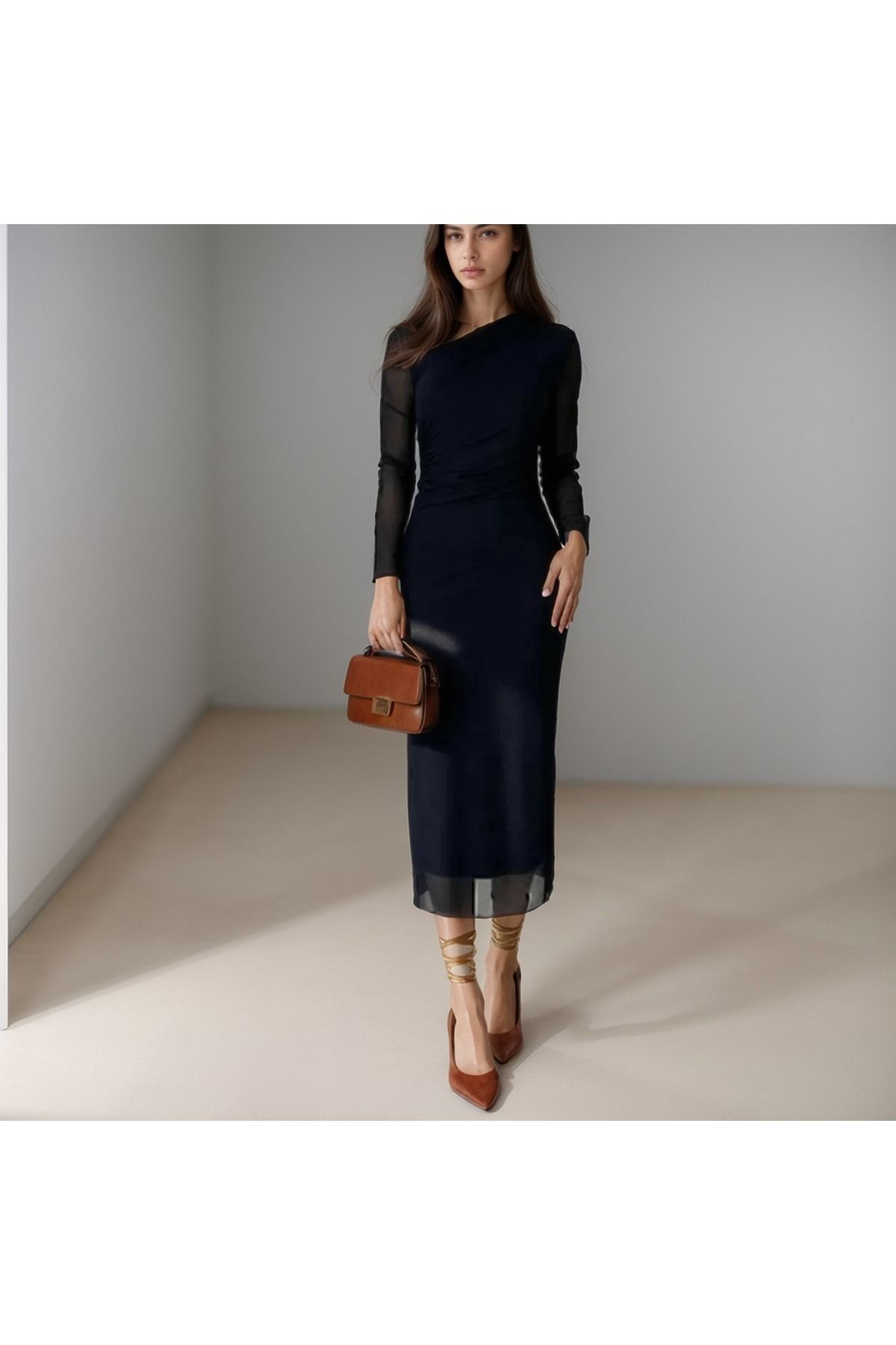 Trendusfashion Siyah Tek Omuz Uzun Kollu Şifon Detaylı Midi Elbise - Zarif Gece Elbisesi