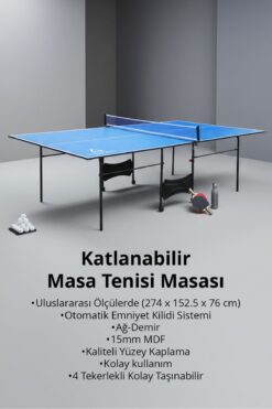 Delta Aventura Dura-Strong Katlanabilir Mavi Masa Tenisi Masası + Ağ-Demir + 2 Raket + 3 Top