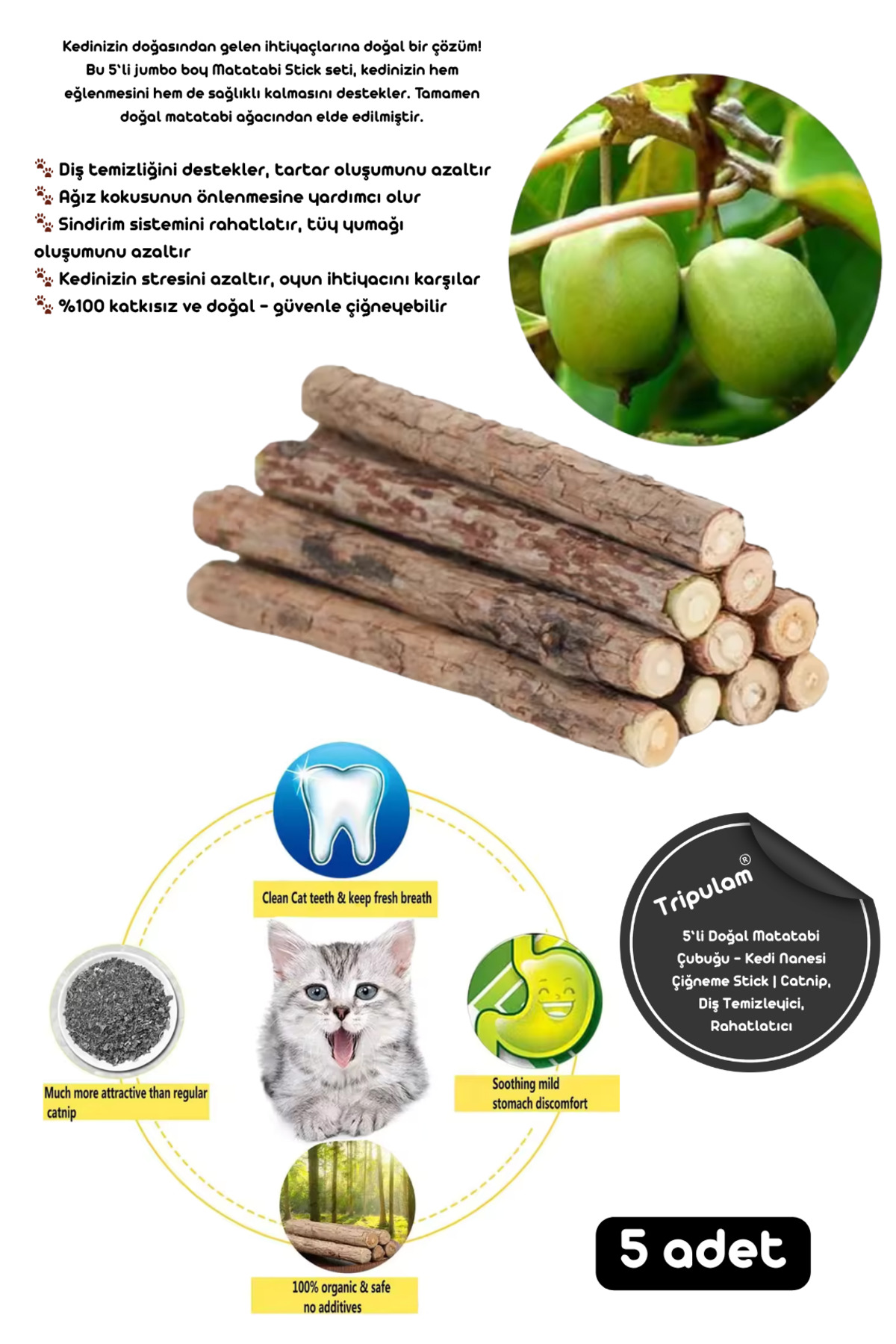 TRİPULAM 5’li Doğal Matatabi Çubuğu – Kedi Nanesi Çiğneme Stick | Catnip, Diş Temizleyici, Rahatlatıcı ürünü ucuz fiyat, hızlı kargo imkanı ile hemen sitemizden sipariş verin.