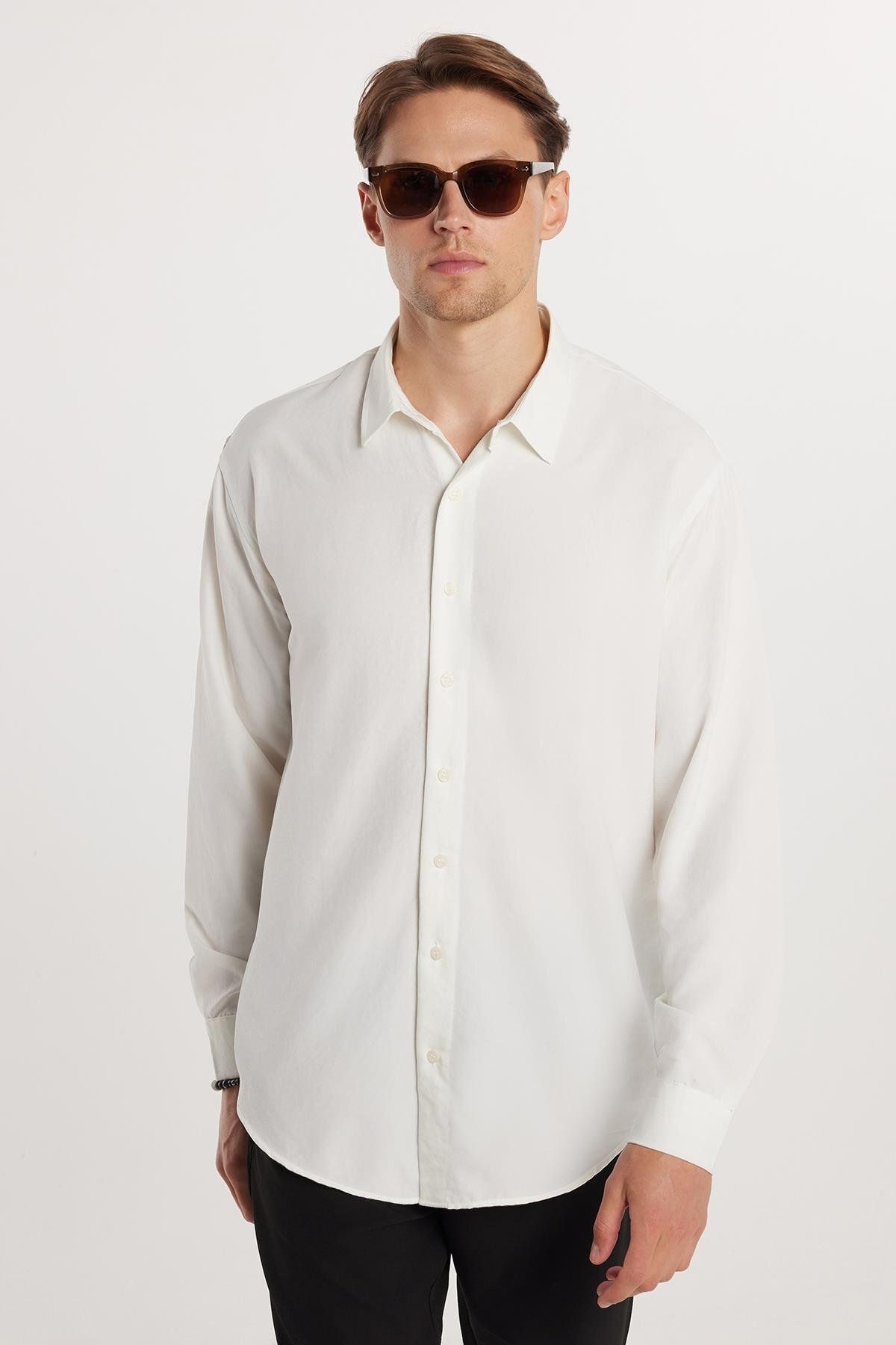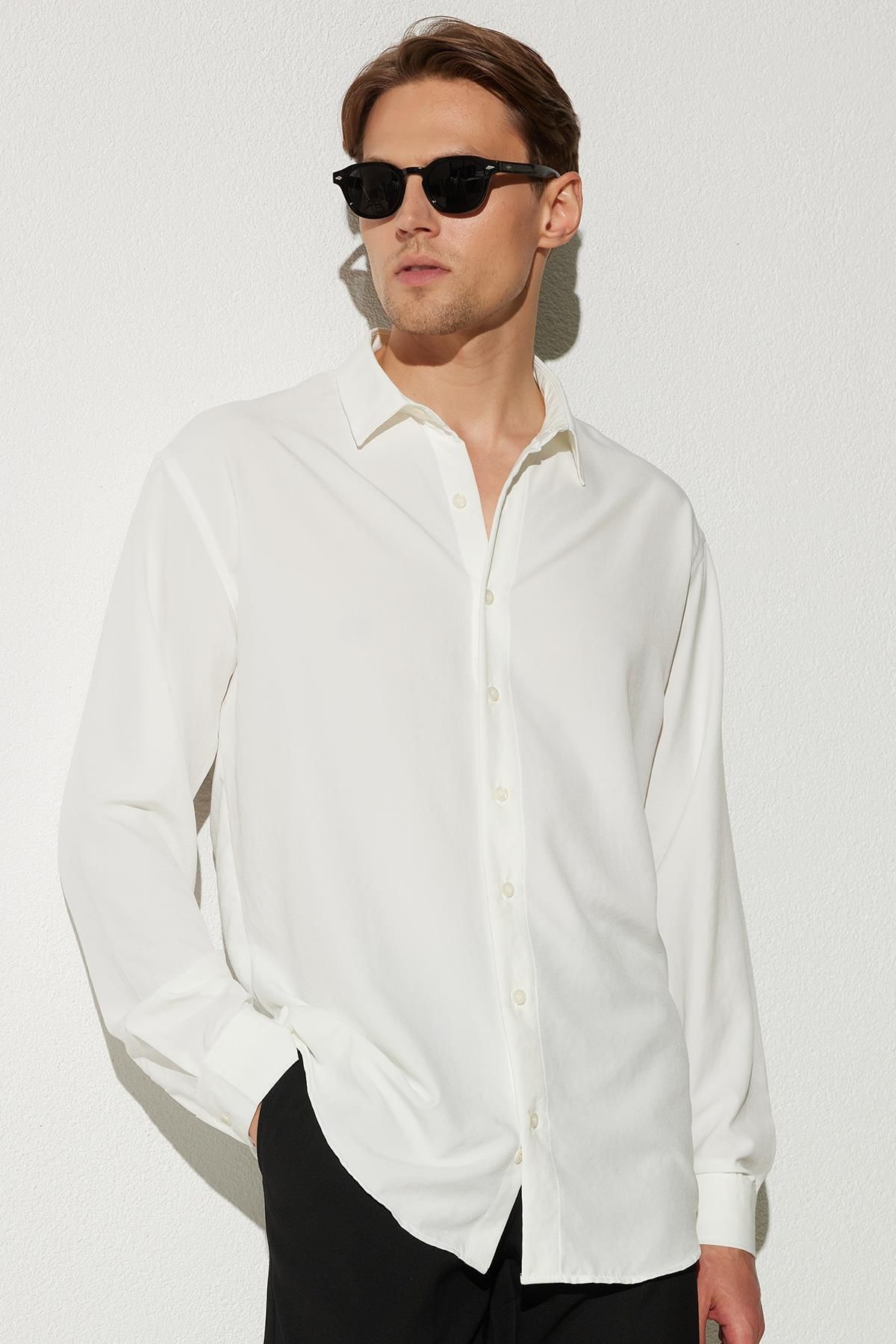 Tudors Oversize Mevsimlik Keten Dokulu Bol Kalıp Uzun Kollu Rahat Kullanım Erkek Beyaz Gömlek