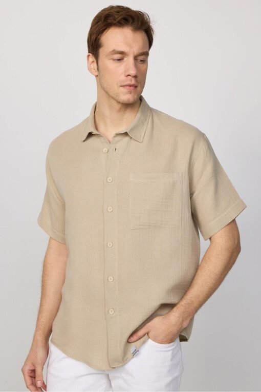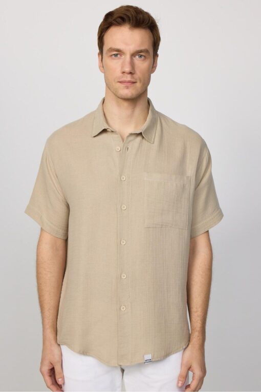 Ana Sayfa » kozmetikara.com » Giyim » Üst Giyim » Gömlek » Tudors Relax Fit Kısa Kollu Rahat Kesim Müslin Kumaş %100 Pamuk Tek Cep Yazlık Düz Krem Erkek Gömlek