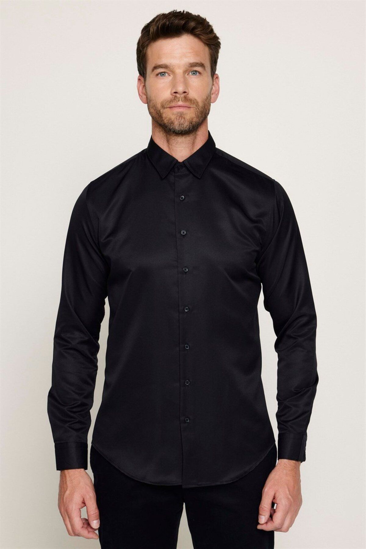 Tudors Slim Fit Uzun Kollu Kolay Ütü Teri Emen Nefes Alan Doku Kravatlık Dört Mevsim Siyah Erkek Gömlek