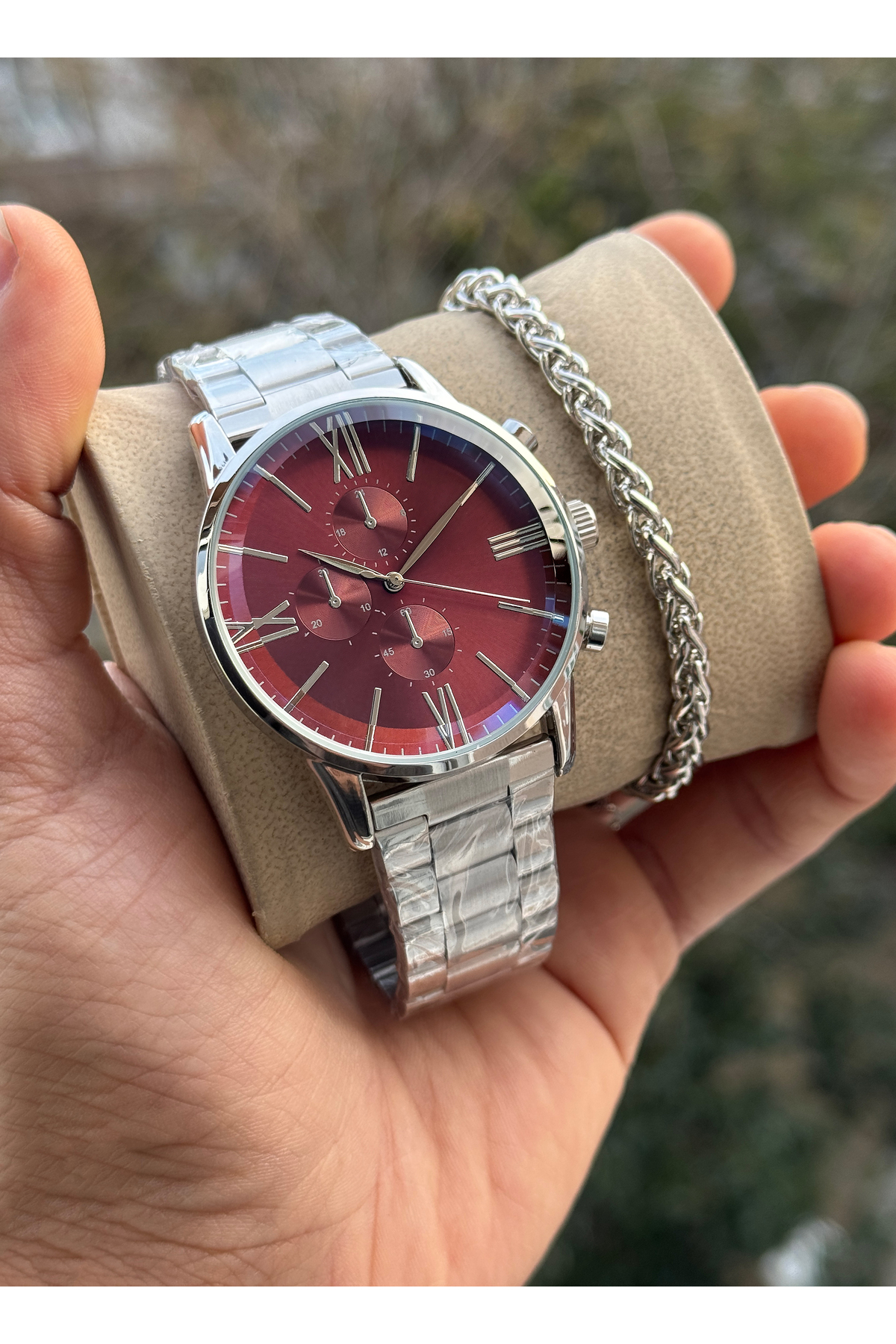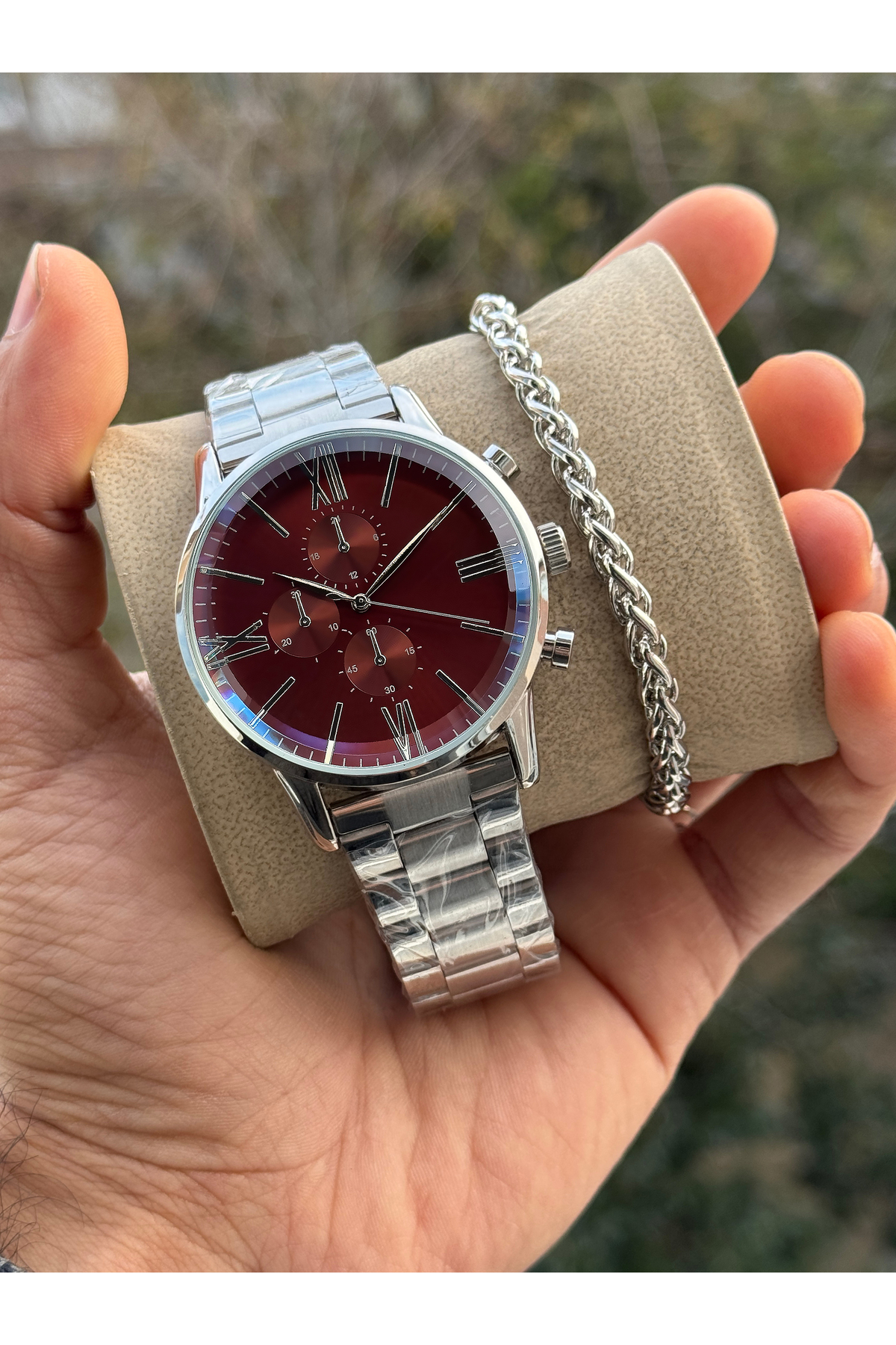 Tulpar Bileklik Hediyeli Çelik Kordon Gümüş Renk Bordo Kadran Erkek Kol Saati